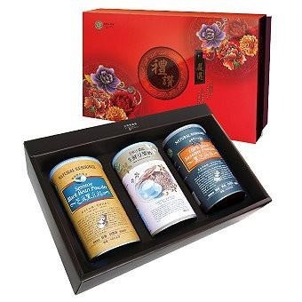 內容包裝:整盒包含黑芝麻粉450公克/罐、生鮮豆漿奶500公克/罐、芝麻黑豆粉500公克/罐。