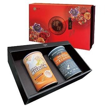 內容包裝:整盒包含黑芝麻粉450公克/罐、綜合帶皮銀耳杏仁粉500公克/罐。