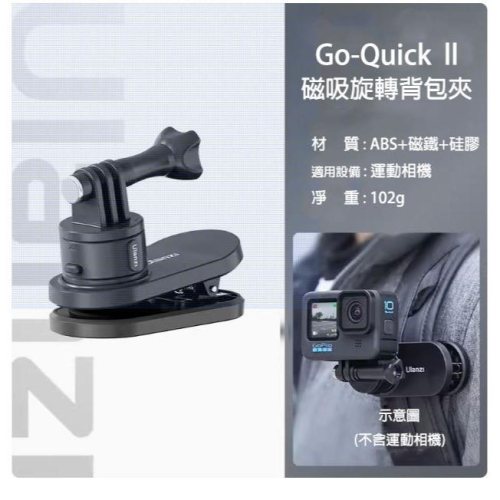 Ulanzi Go-Quick ll  磁吸旋轉背包夾 材    質:  ABS+磁鐵+硅膠 適用設備:運動相機 凈     重:102g # Ulanzi  #電腦包 #收納包 #攝影包 #斜背包 #肩背包 #單肩 #背包夾 #運動相機 #配件 #3169
