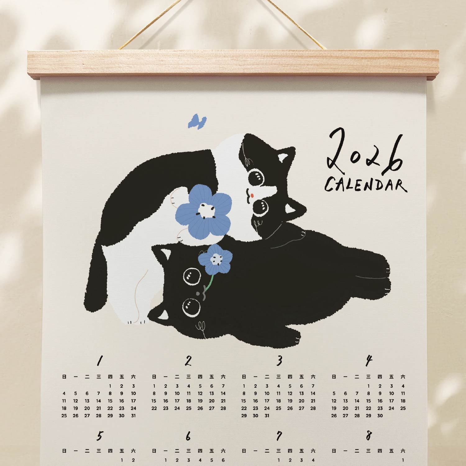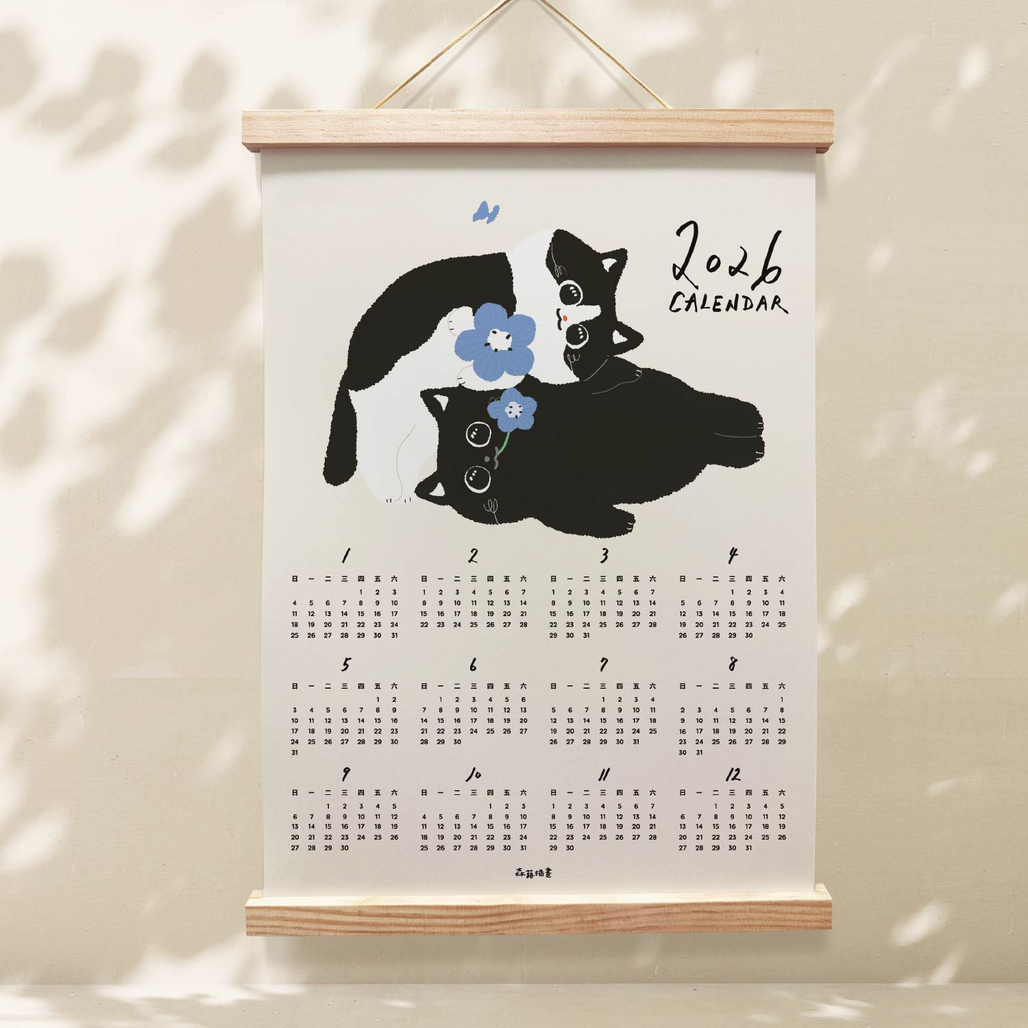 森蕗插畫🌲新款🌲 2026 A3年曆黑貓賓士叼花掛曆海報 臥室裝飾牆壁裝飾牆面裝飾居家裝飾房間交換禮物朋友生日禮物