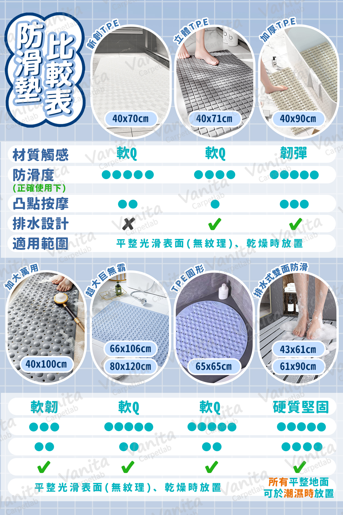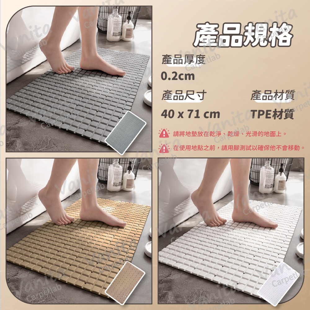 ▶防滑墊只適用於平整光滑之地面,凹凸不平的材質或平面皆不適合。此地墊只適合放浴室。