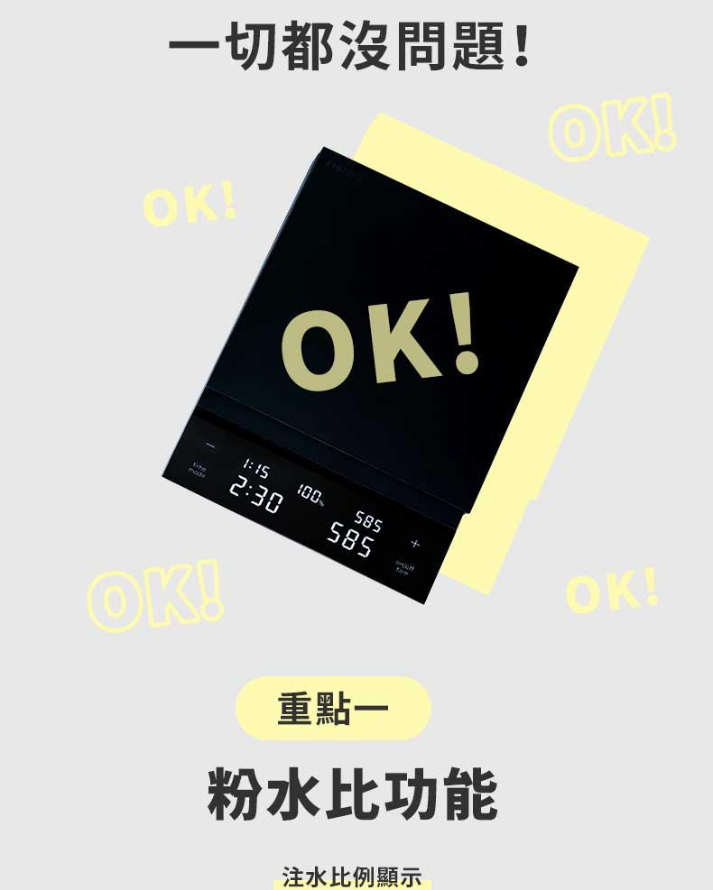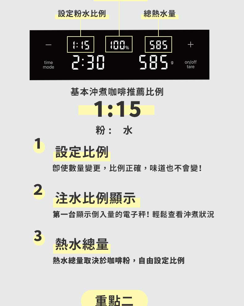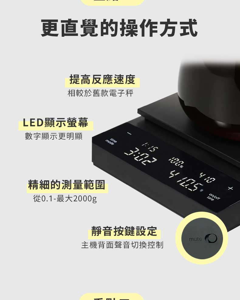 這是一款能夠直觀了解沖泡進度的咖啡秤,有助於提高配方的重現性。