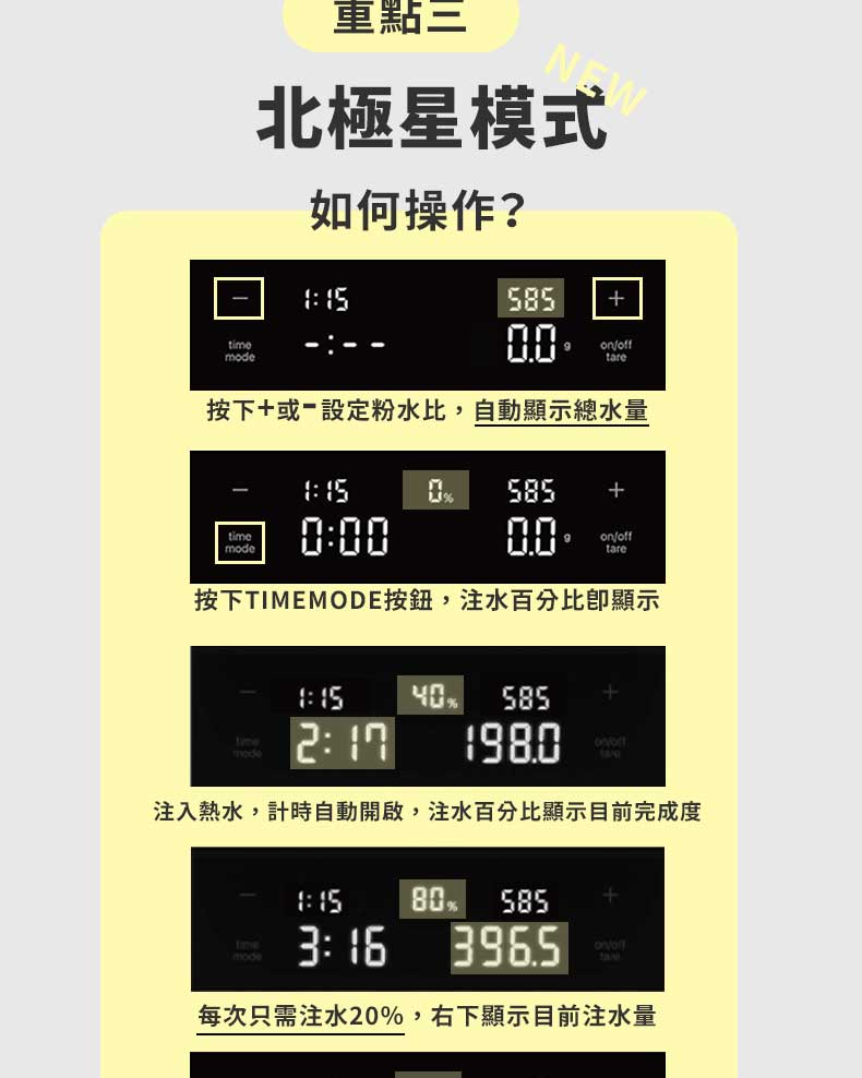 在沖泡咖啡時,根據咖啡豆的產地和烘焙程度來調整粉量和注水量,從而享受味道的變化。然而需要進行各種計算,並且管理配方也會變得複雜。Polaris模式通過百分比顯示來支持理想的萃取。無需再進行每次投放的水量計算,只需要簡單確認每次倒水比例即可輕鬆重現理想配方。
