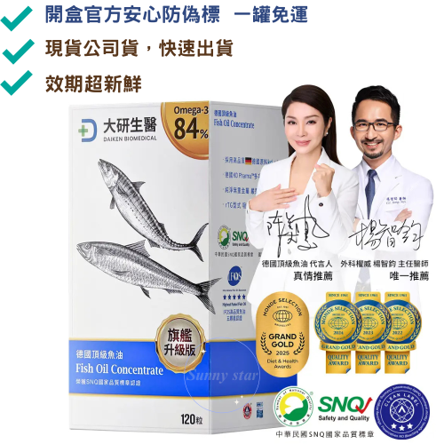 特別推薦給大考、小考接連不斷的學生族 →每天忙碌打拼的上班族 →想維持活力的銀髮族 →三餐不規律、想調整體質的外食族 →對飲食有要求、追求80%以上 Omega-3 的健康族 服用時機:魚油屬於油脂類保健食品,結構與食物中的油相似,因此飯後服用能幫助吸收效果更佳。 【品牌名稱】大研生醫 【商品品名】大研德國頂級魚油軟膠囊 【商品成分】魚油(含魚油(含Omega-3脂肪酸)、混合濃縮生育醇(抗氧化劑))。 【膠皮成分】明膠、甘油、純水。 【內容量】60粒/每粒820毫克(含膠囊220毫克)。 【食用方式】:一般保養每日2粒,加強保養早晚各2粒,建議隨餐或飯後搭配開水食用,多食無益。 【保存方式】請置於陰涼乾燥處,避免陽光直射,開罐後請儘早食用完畢。 【最新有效日期】2028.01.13 【原產地】產地:台灣(魚油原料產地:德國) 【貨源】原廠公司貨 【注意事項】1.孕婦、哺乳婦女、重大疾病服用藥物者、凝血功能不佳者、將要進行手術、或接受任何治療其可能影響血液凝血功能者,請先諮詢醫師或醫療專業人員意見後再食用。2.本產品含有魚類製品,不適合其過敏體質者食用。 https://s-cf-tw.shopeesz.com/file/tw-11134208-7ra0m-mdajgip0cg8v66 https://s-cf-tw.shopeesz.com/file/tw-11134208-7ra0r-mdajgip0b1of4e