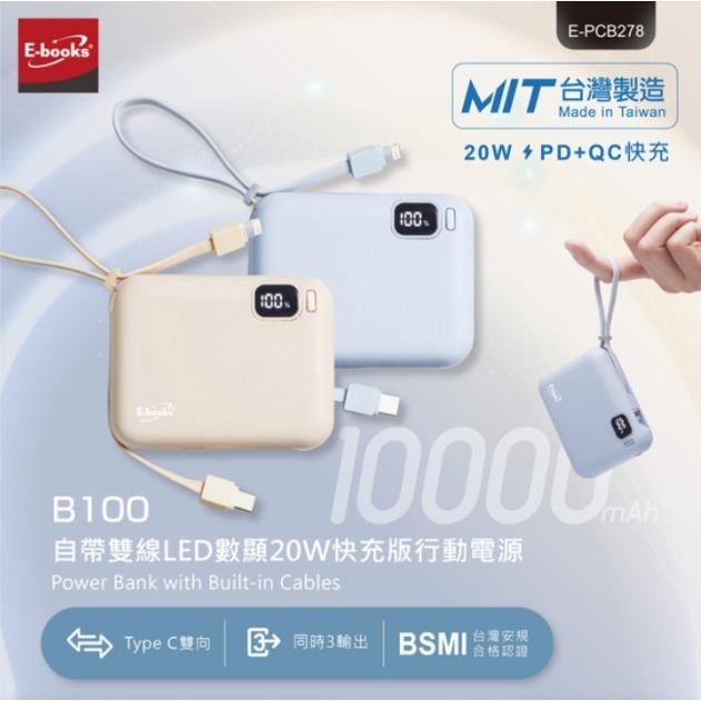 E-books 台灣製B100自帶雙線LED數顯20W快充版行動電源 旅行用 出門免帶線