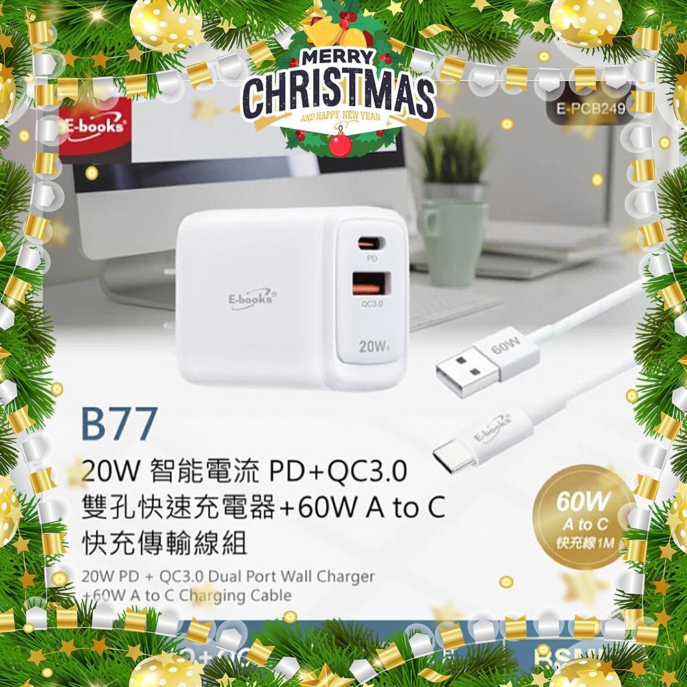 E-books B77 20W智能電流 PD+QC 3.0 充電器 + 60W快充傳輸線組 快充組合