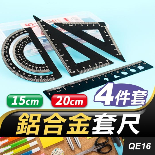 板橋現貨【鋁合金套尺四件套】三角尺.量角器.直尺.中小學生三角板.鋁合金尺子 4件套.直角三角板【傻瓜批發】QE16