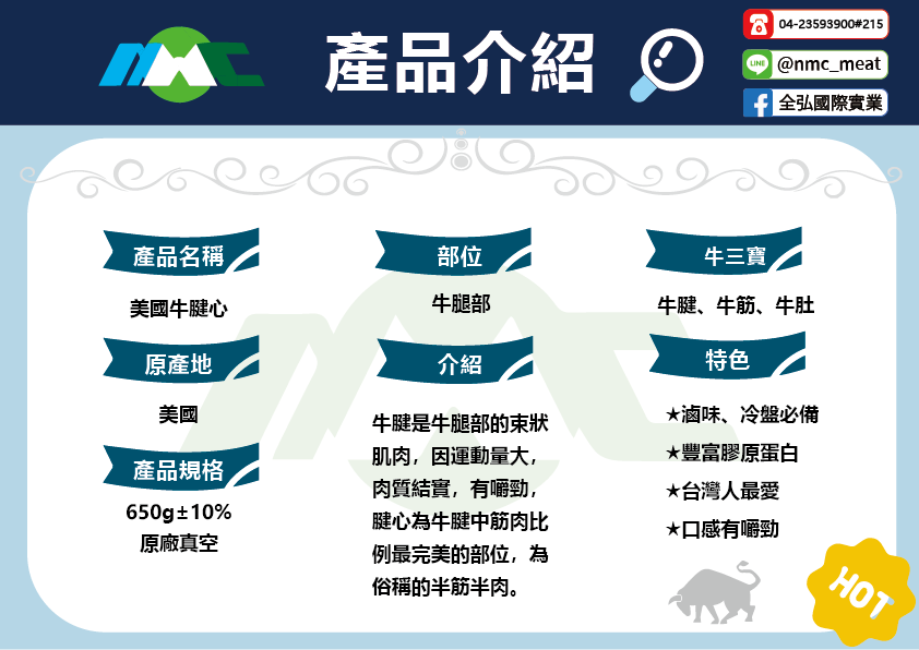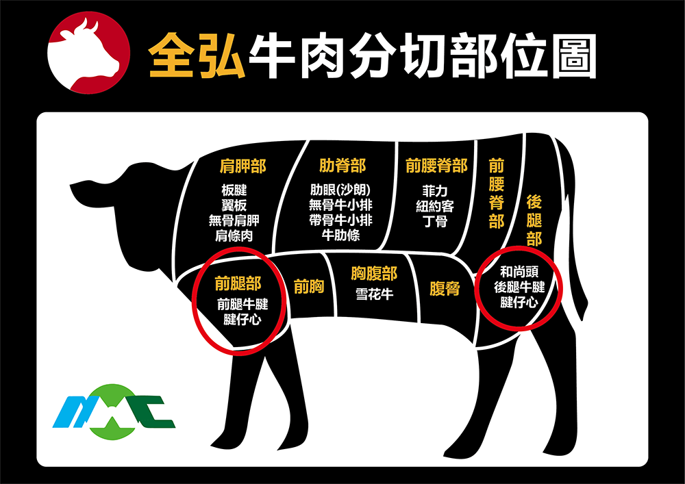 | 全弘國際實業股份有限公司為全台數一數二的牛肉、羊肉、豬肉進口商。 除了美國、紐西蘭、澳洲、加拿大、丹麥、西班牙、中南美洲各國的進口通路外, 全弘更是台灣巴拉圭牛肉進口量排名佔有一席之地的進口商。 全弘致力於肉品的推廣,除了批發外,近年來客群更從店家擴展至散客,零售通路開發使家庭也能以最實惠的價格買到高檔牛肉。 牛腱心不論是拿來滷,或是切成冷盤,都適用喔!俗稱的半筋半肉,牛腱中的黃金比例。 |