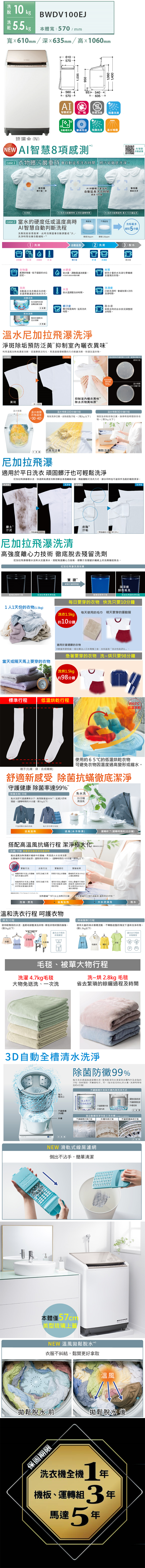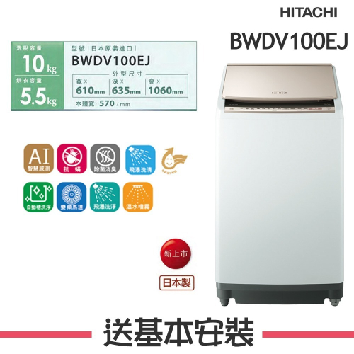【HITACHI 日立】10KG 直立式洗脫烘洗衣機 BWDV100EJ-N琉璃金