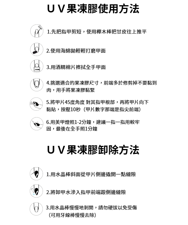 - 使用UV果凍膠可維持時間較長,大約7天卸除重新換一次UV果凍膠,以免滋生細菌
