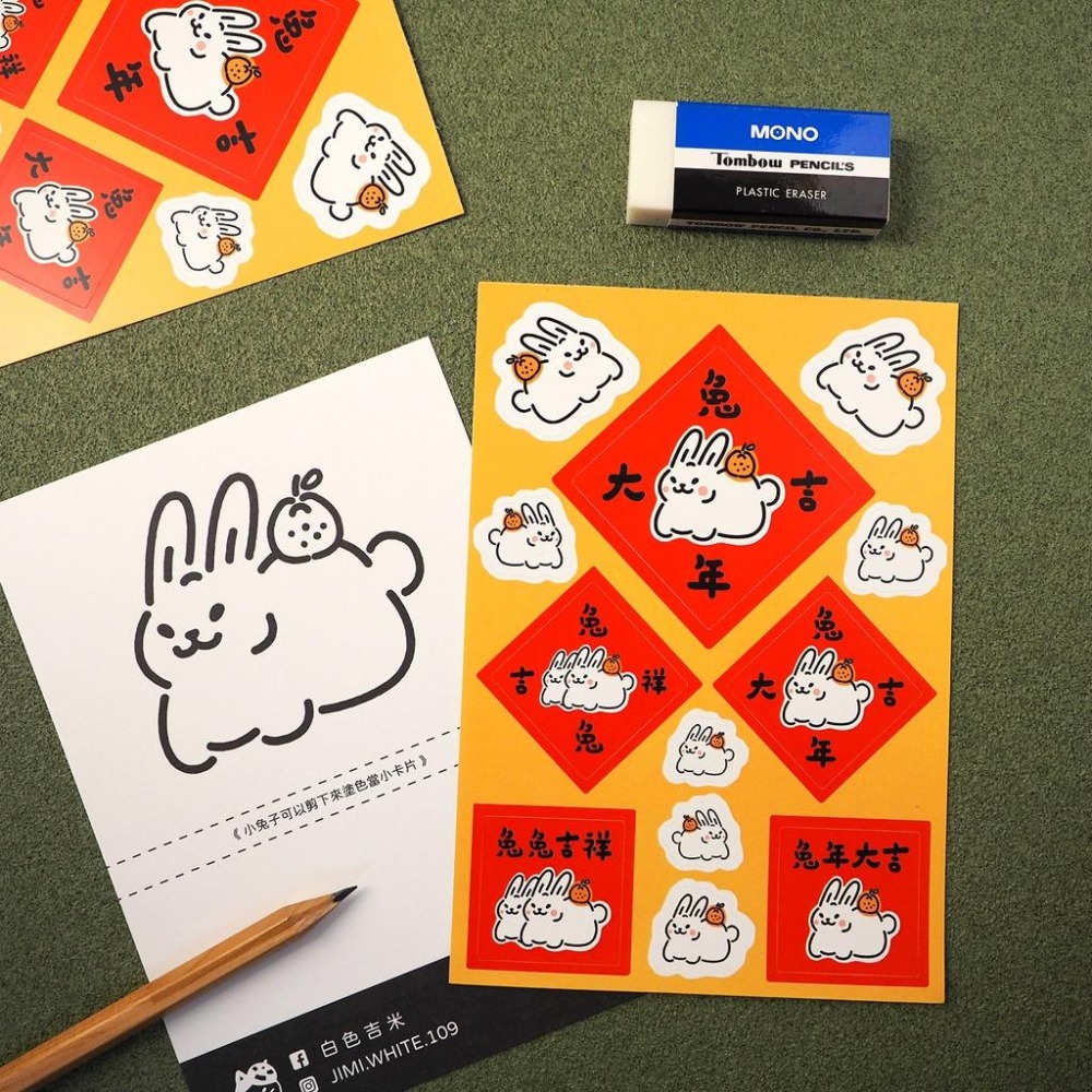每份貼紙背面都有一張襯卡,背卡的兔子可以塗色剪下來當小卡片,除了春聯貼紙還有小卡可自行創作運用。