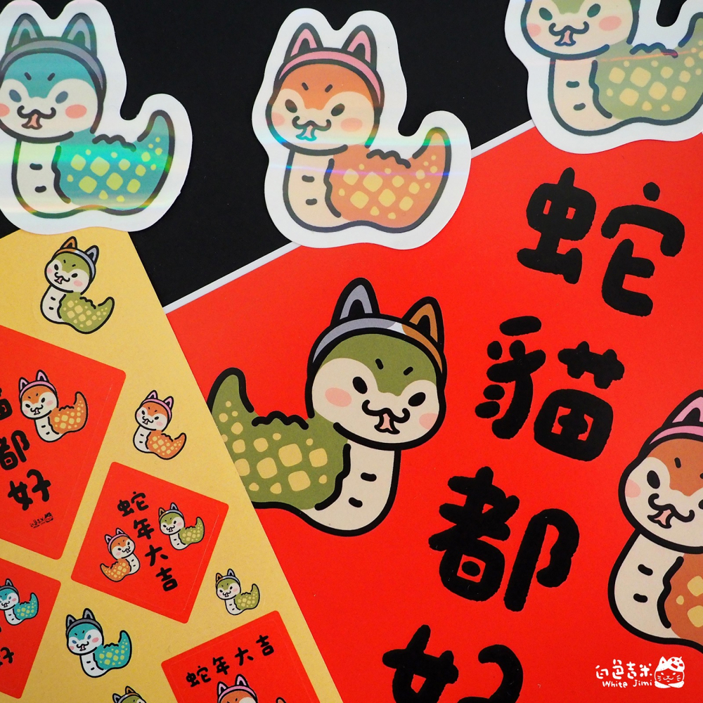 內容物:大春聯貼紙+小春聯貼紙+貓貓蛇彩虹防水小貼紙(三色)各一組