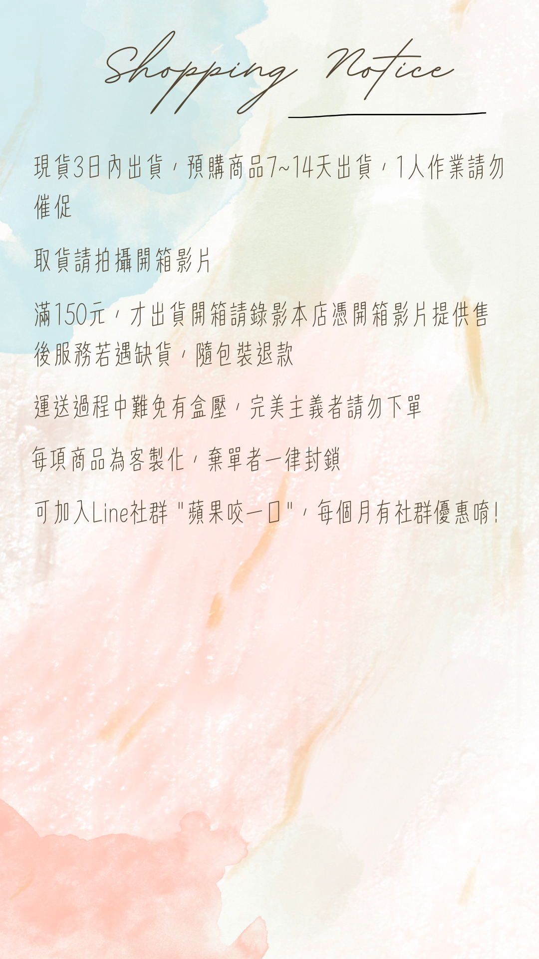 <p><span style="font-family:'-apple-system', BlinkMacSystemFont, 'Segoe UI', Roboto, 'Helvetica Neue', Arial, 'Noto Sans', sans-serif, 'Apple Color Emoji', 'Segoe UI Emoji', 'Segoe UI Symbol', 'Noto Color Emoji'&#59;font-size:1rem&#59;">📍 </span><span style="font-size:1rem&#59;font-family:'-apple-system', BlinkMacSystemFont, 'Segoe UI', Roboto, 'Helvetica Neue', Arial, 'Noto Sans', sans-serif, 'Apple Color Emoji', 'Segoe UI Emoji', 'Segoe UI Symbol', 'Noto Color Emoji'&#59;">滿150元</span><span style="font-size:1rem&#59;font-family:'-apple-system', BlinkMacSystemFont, 'Segoe UI', Roboto, 'Helvetica Neue', Arial, 'Noto Sans', sans-serif, 'Apple Color Emoji', 'Segoe UI Emoji', 'Segoe UI Symbol', 'Noto Color Emoji'&#59;">,</span><span style="font-size:1rem&#59;font-family:'-apple-system', BlinkMacSystemFont, 'Segoe UI', Roboto, 'Helvetica Neue', Arial, 'Noto Sans', sans-serif, 'Apple Color Emoji', 'Segoe UI Emoji', 'Segoe UI Symbol', 'Noto Color Emoji'&#59;">才出貨</span><span style="font-size:1rem&#59;font-family:'-apple-system', BlinkMacSystemFont, 'Segoe UI', Roboto, 'Helvetica Neue', Arial, 'Noto Sans', sans-serif, 'Apple Color Emoji', 'Segoe UI Emoji', 'Segoe UI Symbol', 'Noto Color Emoji'&#59;">開箱請錄影本店憑開箱影片提供售後服務。</span></p><p>📍1人作業請勿催促,因為愛買所以分享</p><p>📍<span style="font-family:'-apple-system', BlinkMacSystemFont, 'Segoe UI', Roboto, 'Helvetica Neue', Arial, 'Noto Sans', sans-serif, 'Apple Color Emoji', 'Segoe UI Emoji', 'Segoe UI Symbol', 'Noto Color Emoji'&#59;font-size:1rem&#59;">若遇缺貨,會直接袋內退現金</span></p><p>📍 運送過程受傷難免,完美主義者請勿下單。</p><p>📍預購需等待7~14工作天</p><p>📍可加入Line社群 "蘋果咬一口文具選品",每個月有社群優惠唷!</p>