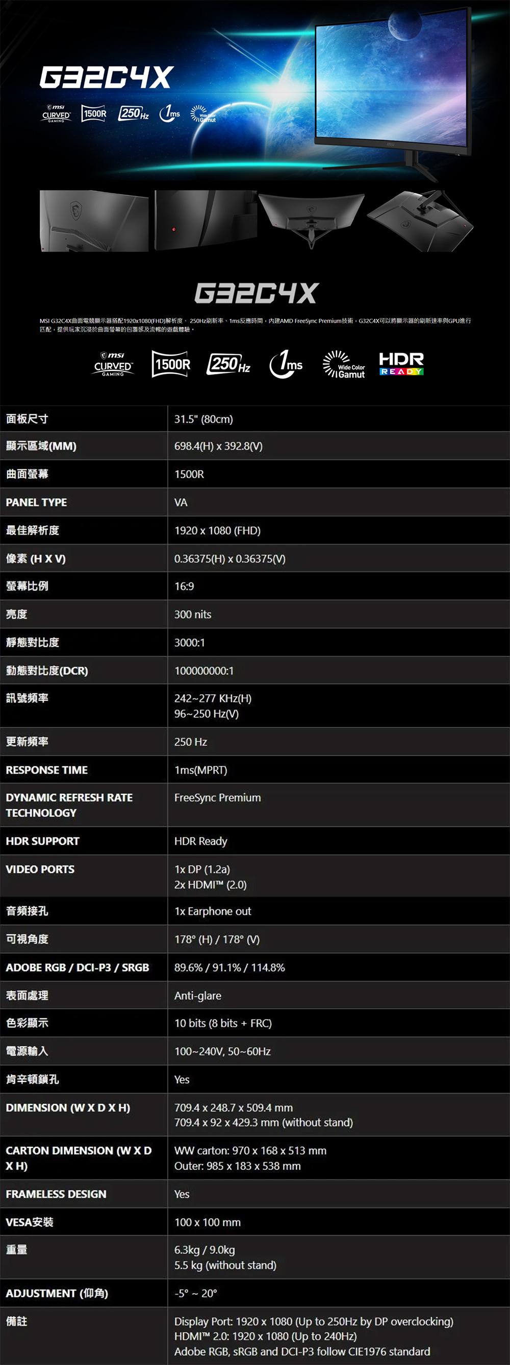 MSI 微星 G32C4X 32型 VA 250Hz 曲面電競螢幕