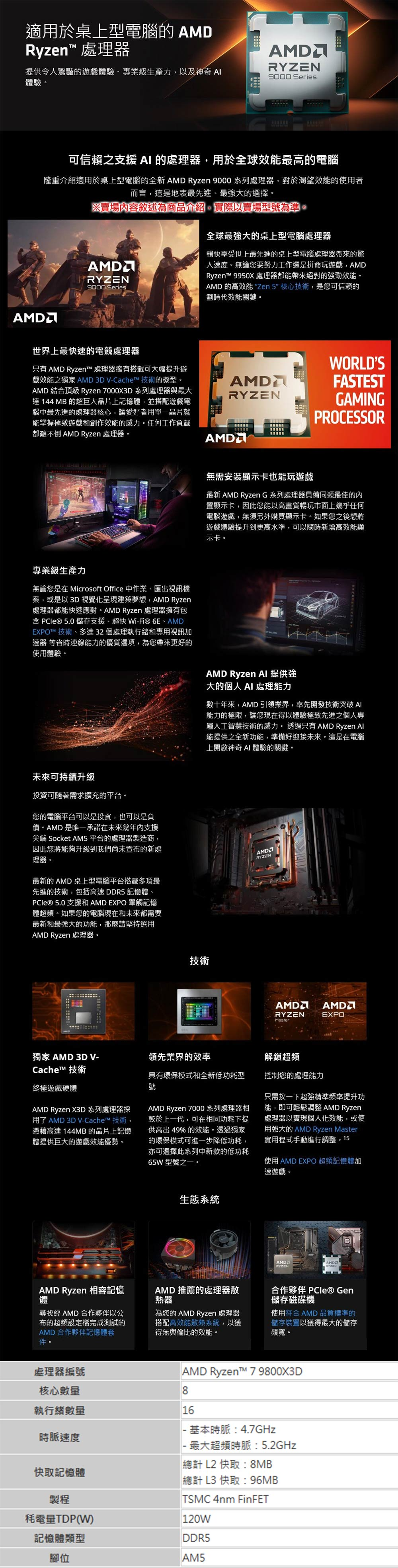 AMD 超微 Ryzen7 9800X3D 8核心/16緒 中央處理器 (代理商 含稅,附發票)