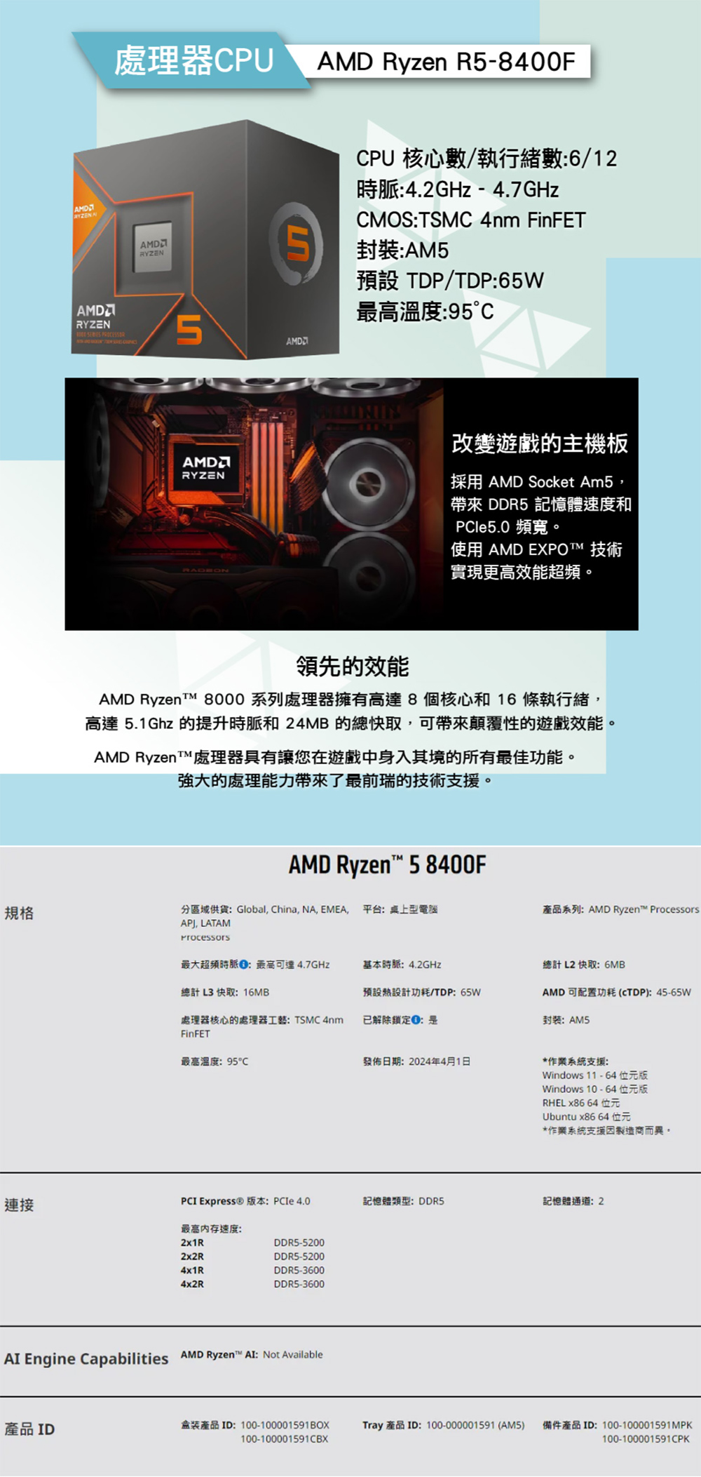 AMD超微 Ryzen 5 8400F【6核/12緒】AM5/無內顯/含風扇/CPU處理器(含稅,附發票)