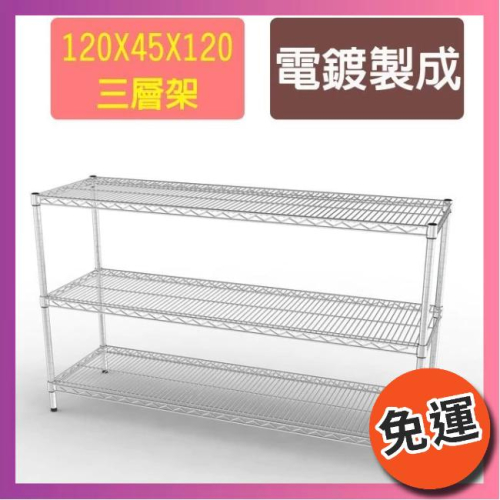 !! 訂購前請先聊聊詢問是否有貨 !! 【商品特色】 1.台灣製造,品質保證 2.美化空間讓物品更井然有序 3.採二層電鍍,抗腐蝕、耐酸鹼 4.一體成型設計,上下管採用螺牙連接 5.穩定耐重牢靠,不易晃動,且可無限加高 6.靜態平均荷重每層約65公斤左右 【商品規格】 品名:百變王-120*45*120三層鐵架 顏色:銀 產地:台灣 材質:鐵絲、鐵管 尺寸:面寬120cm*深45cm*高120cm(±5%) 產品荷重:靜態平均荷重每層約65公斤左右 管徑:25.4mm -DIY商品- 【注意事項】 配送區域:台灣本島;外島無配送 台灣偏遠地區保留出貨與否的權利 網頁圖片僅為示意圖參考,不含拍攝道具 此商品請勿試用,鑑賞期為鑑賞非試用
