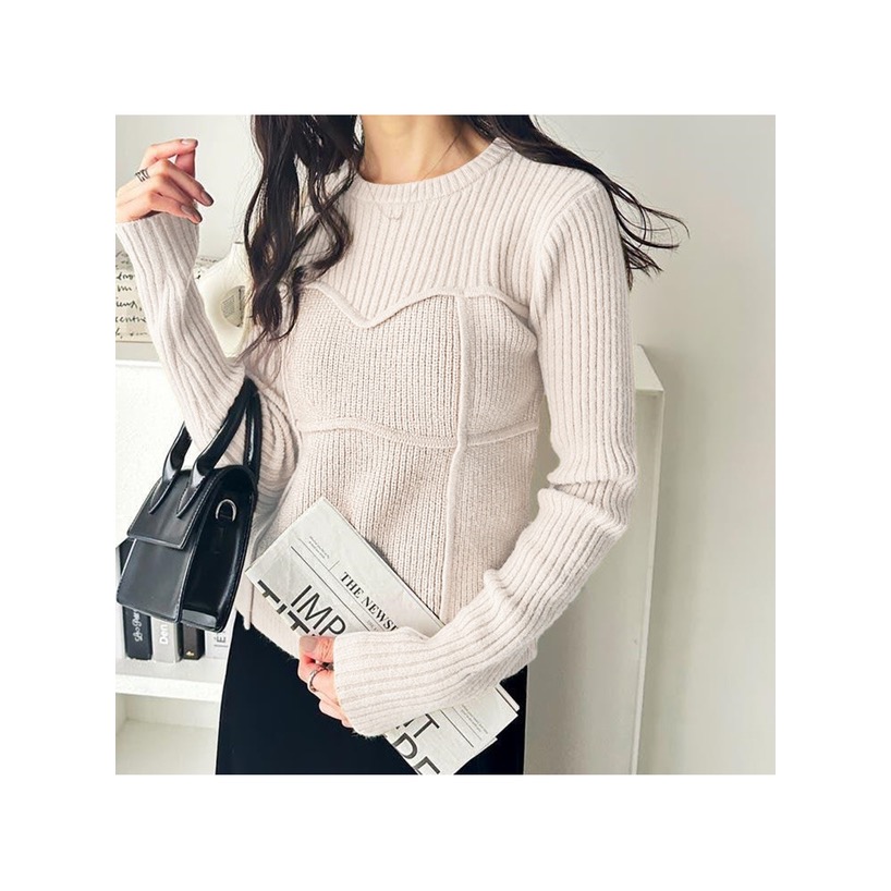 編み地の変化でビスチェをドッキングしたかのようなユニークさが特徴のニットトップス。