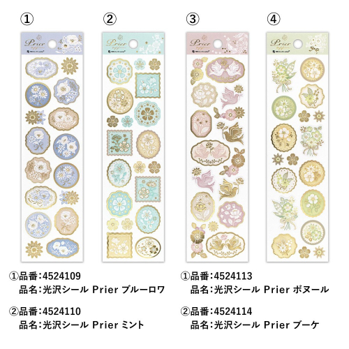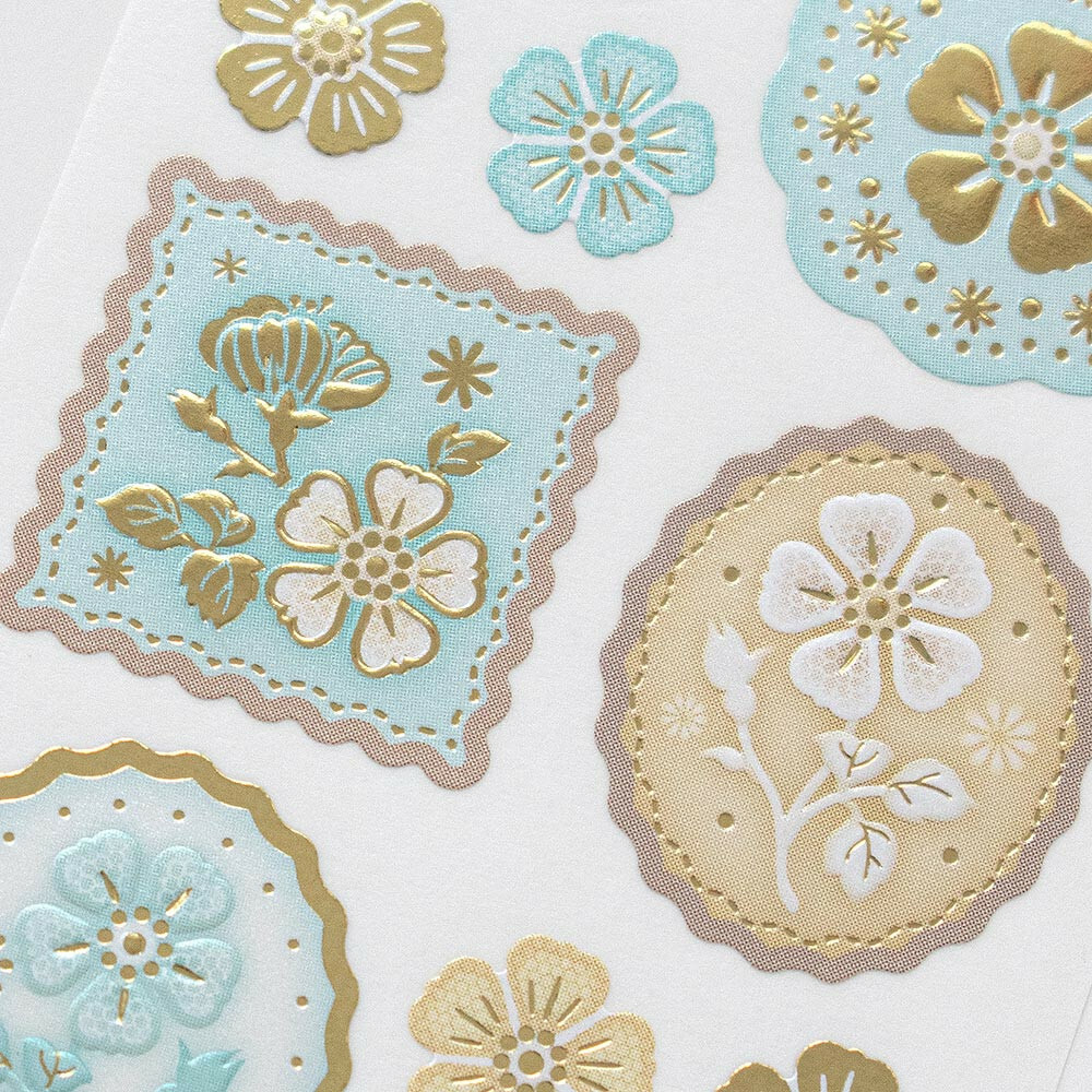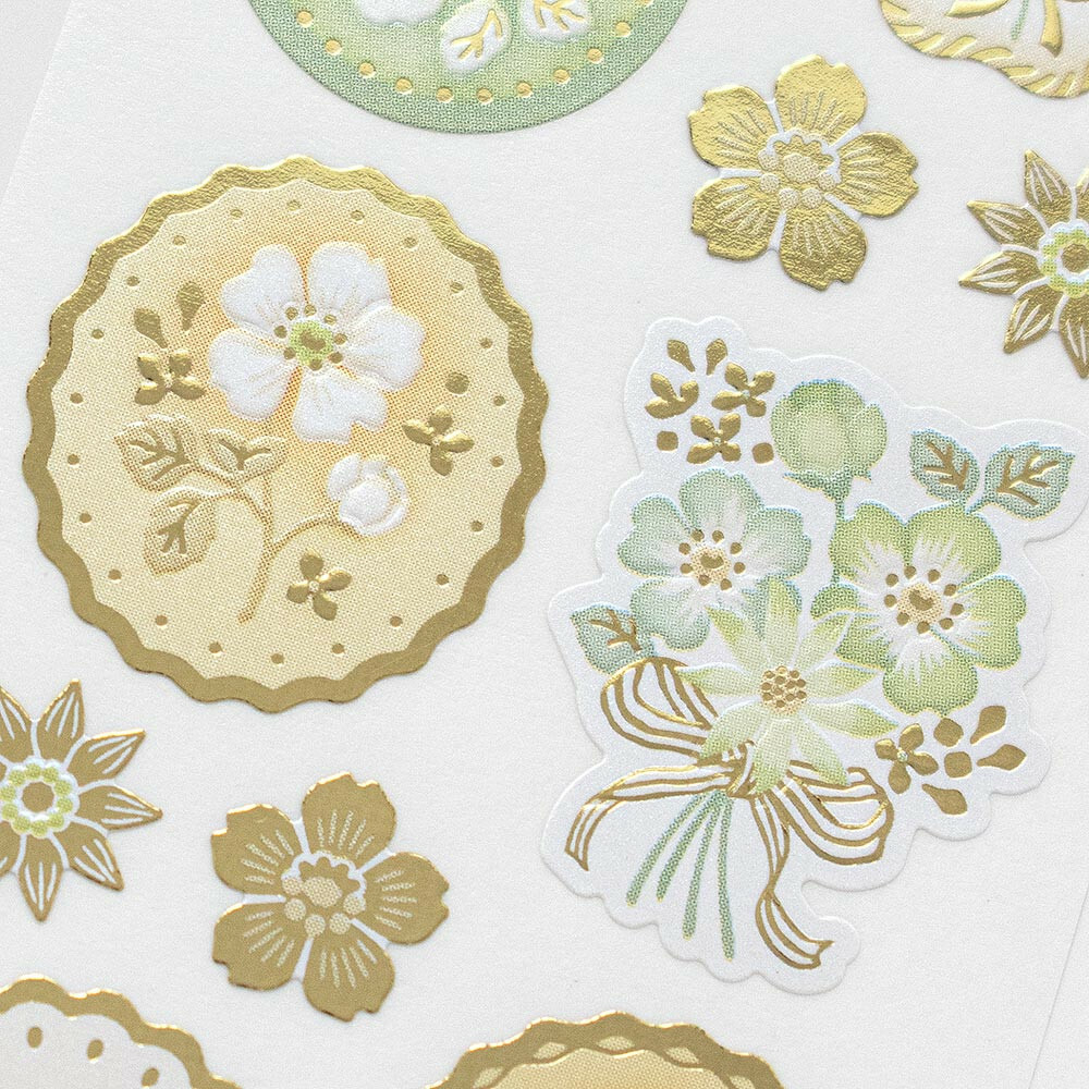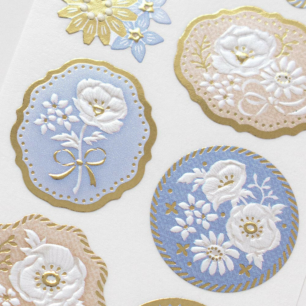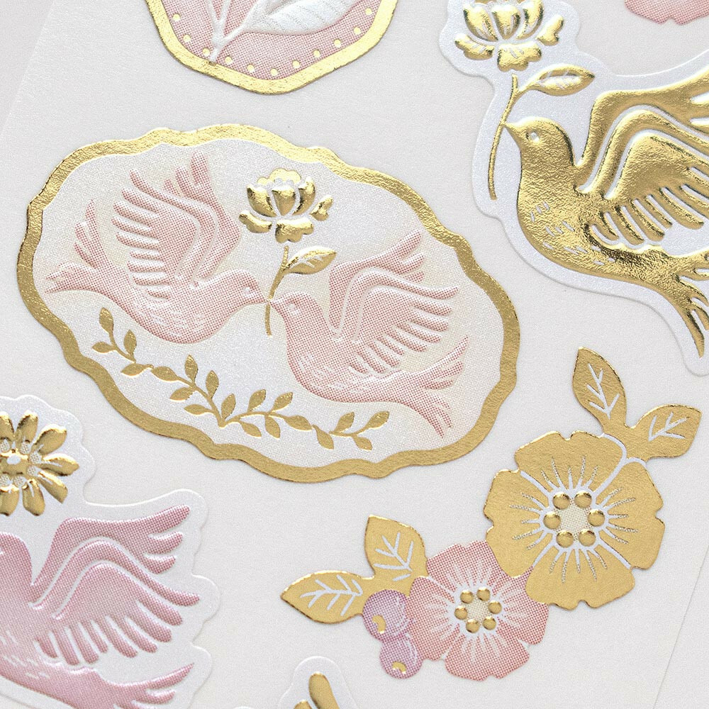 這款貼紙由柔和閃亮的珠光紙製成,帶有圓形壓花和金箔燙印。