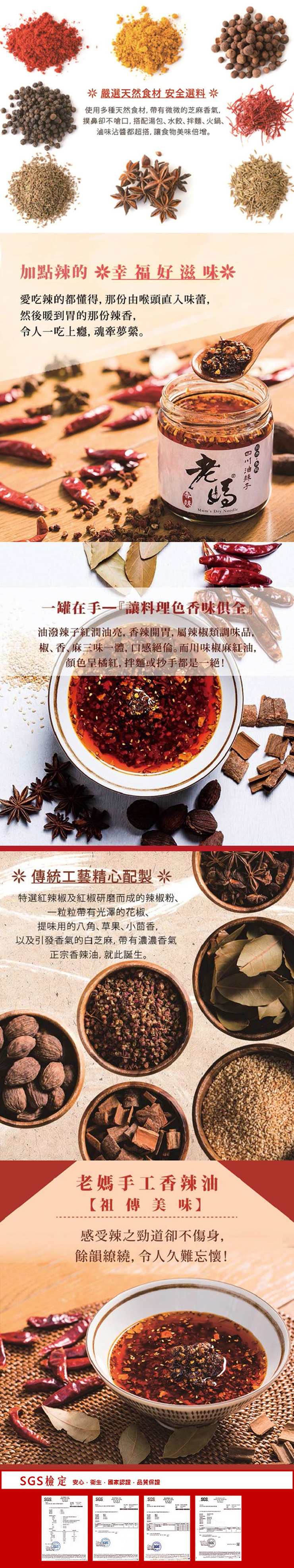 內容物成分:芥花油、乾辣椒粗粉、花椒粉、食鹽、白砂糖、蔥、薑、熟白芝麻粒、蒜、草果、香油(芝麻油、大豆油) 、桂皮、八角