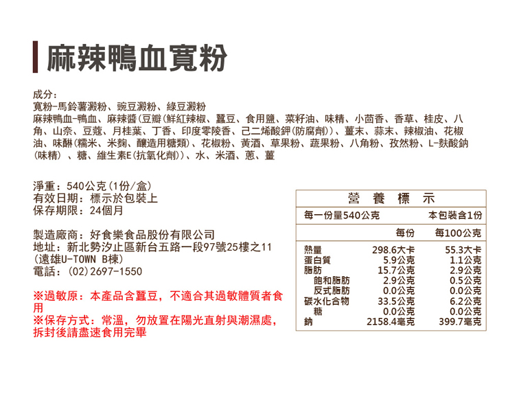 【老媽拌麵】麻辣鴨血寬粉 (540g/盒)