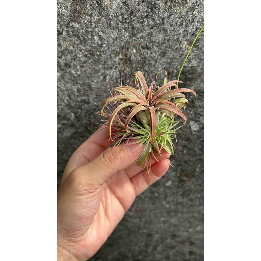 空氣鳳梨,全紅小精靈 (Tillandsia ionantha 'Rubra')喜好強光,體型可達10cm高,外型呈翠綠色,葉序比較緊密,開花時婚姻色的幅度比較大,開紫色管狀花。