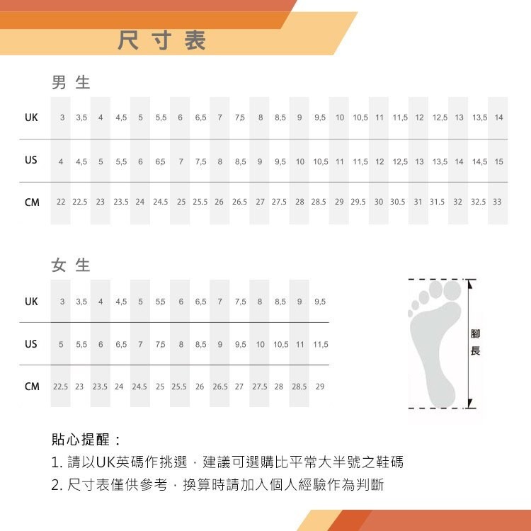 ※尺寸選擇建議以平常穿著的鞋子測量,將腳跟靠緊鞋跟,手摸鞋尖可以摸到腳趾是【合腳】,會建議選擇【合腳】對應的英規UK尺碼再加上0.5-1個尺碼