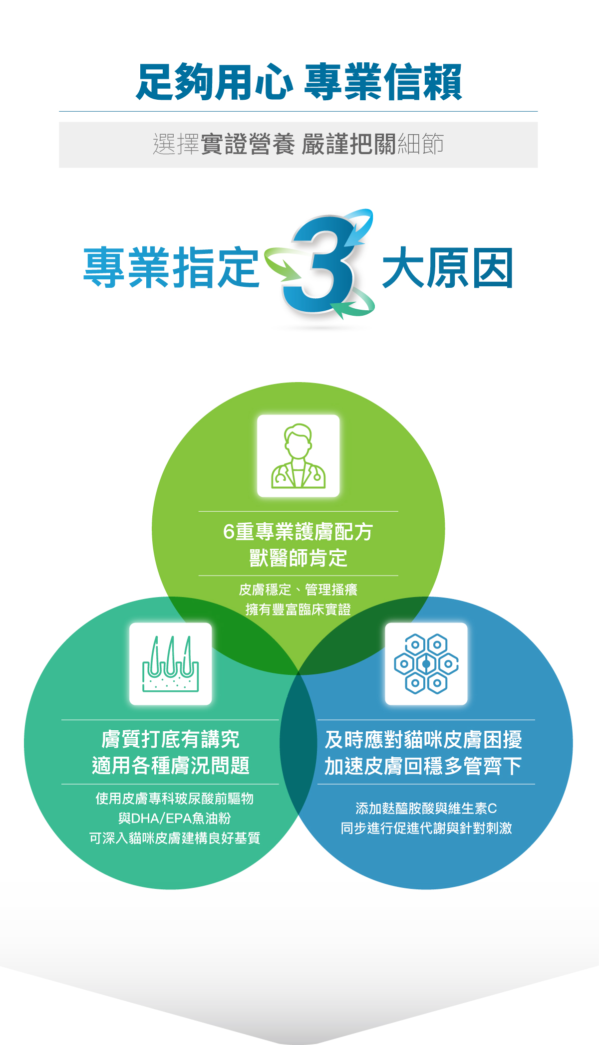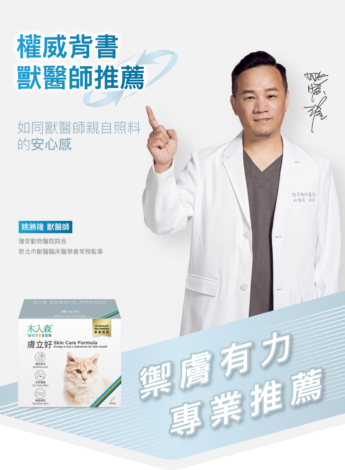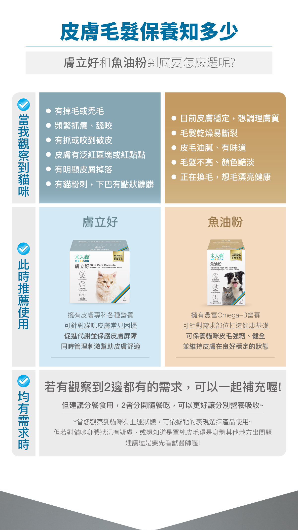 木入森貓咪膚立好,打造貓咪皮膚保健層層防護網,全方位營養搭配,適用皮膚敏感,平衡皮脂分泌與皮膚乾燥,針對搔癢等皮膚刺激,維持皮膚正常功能。適合「需調理膚質,營養加強」、「正值皮膚問題困擾」的貓咪。