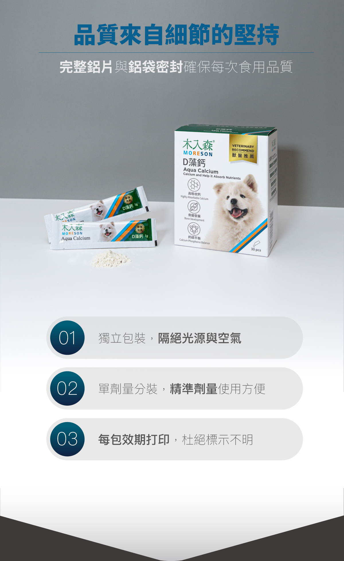 木入森《犬寶D藻鈣》選用 Aquamin F 愛爾蘭海藻鈣,足量每日強健需求 585mg,來自有機紅藻,特殊多孔結構,吸收率極高,含量超越 2 瓶牛奶的牛奶鈣,是最佳的補鈣來源。