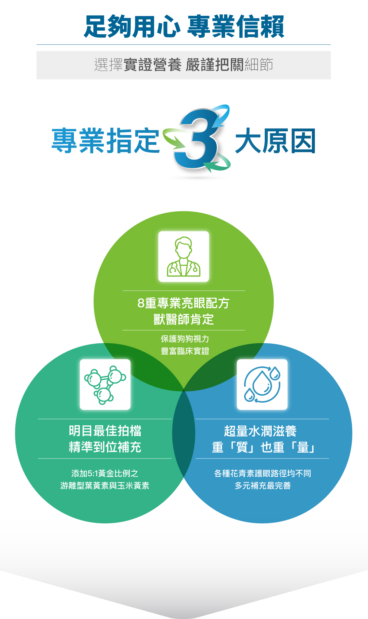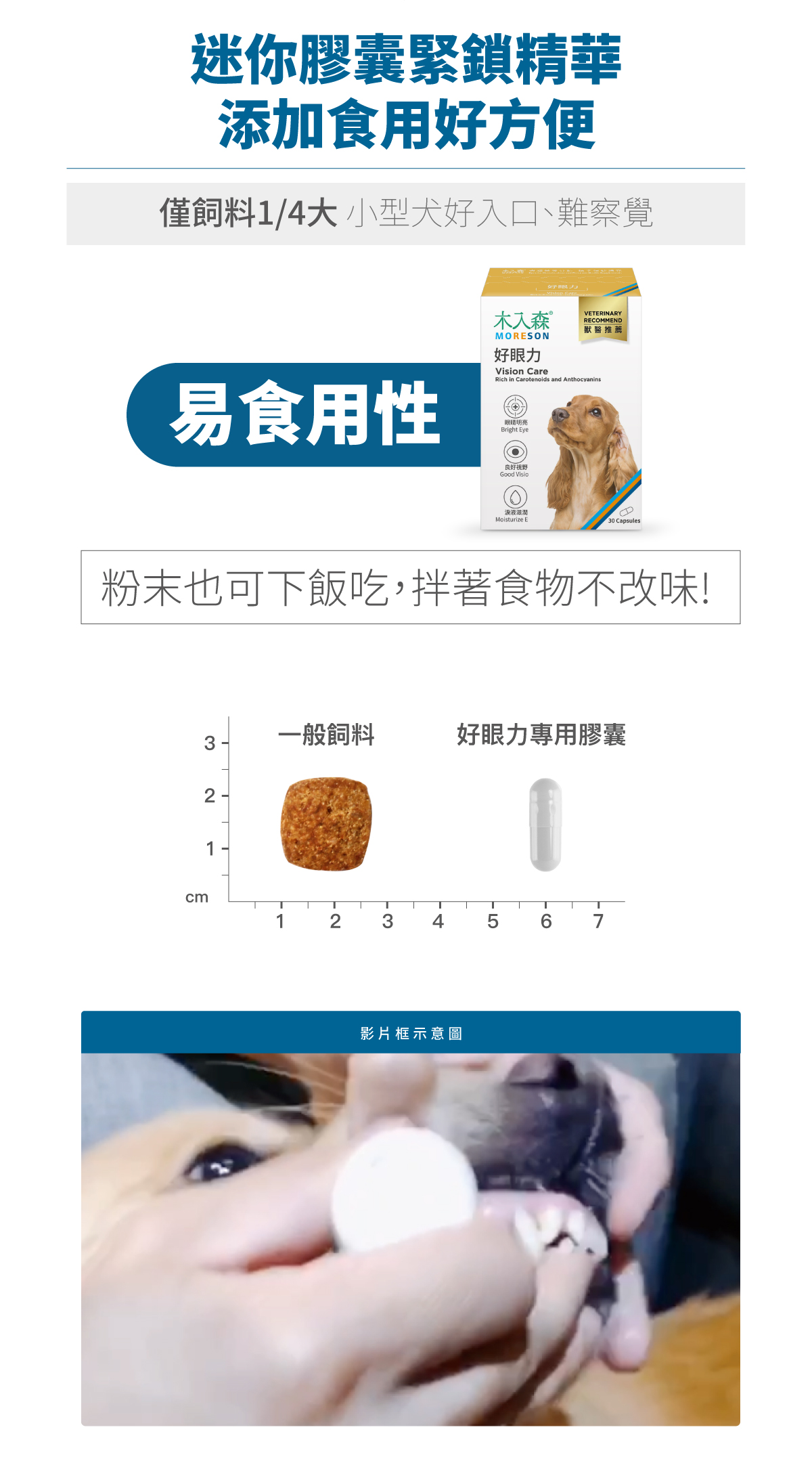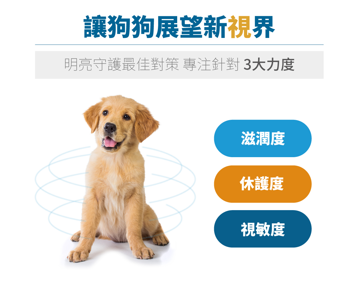 可作為「好發犬種」與「老年狗狗」的營養補充以及「眼睛不適」狗狗的護理營養。