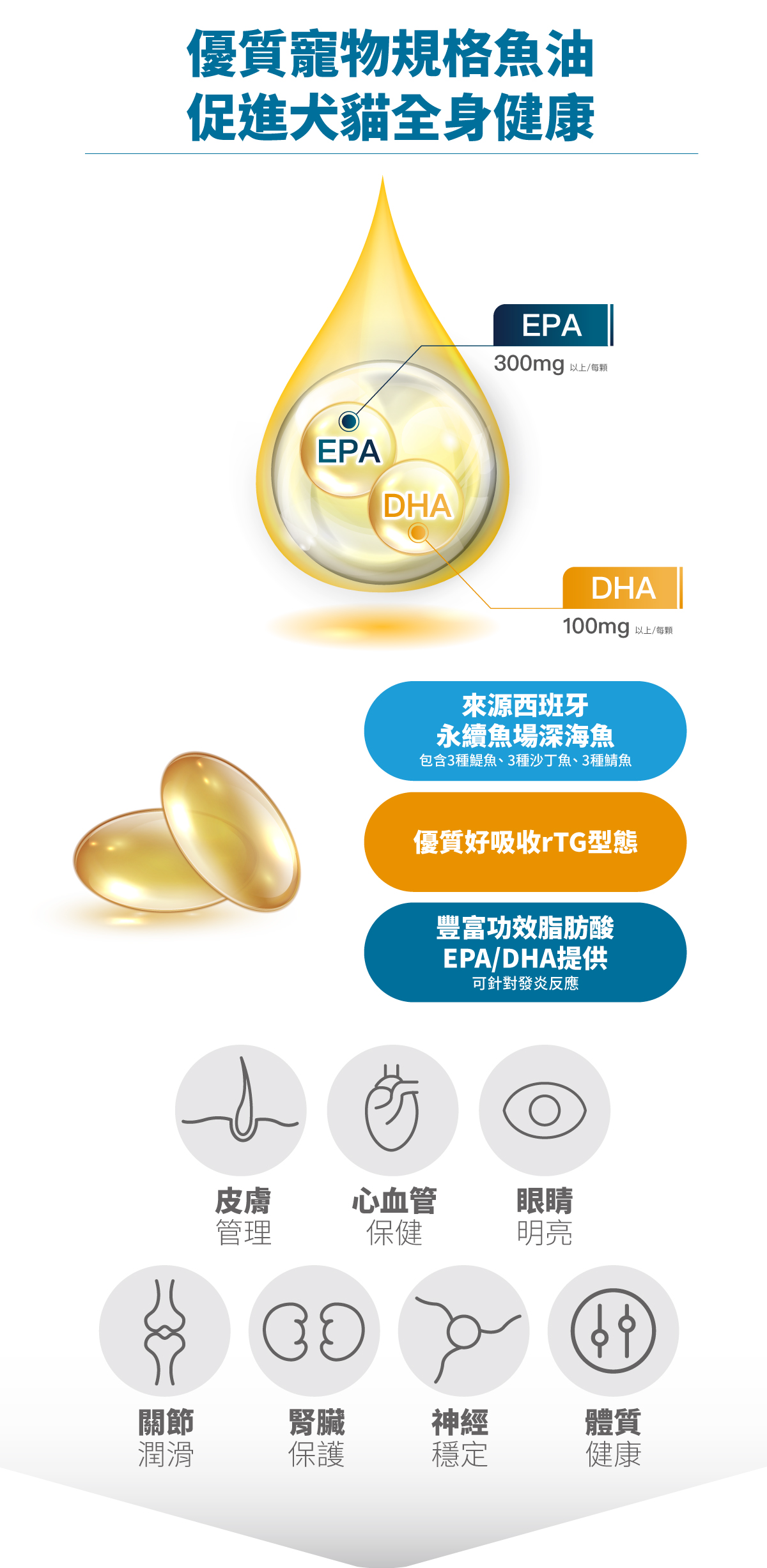 - EPA 適合需要關節、心臟及腎臟保養的貓咪狗狗
