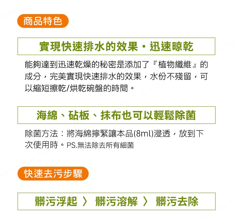 *海綿除菌方式:使用後,將海綿輕輕搓洗並擰乾,以本品8ml浸濕海綿,直至下次使用前再洗淨即可。(無法除去所有細菌)