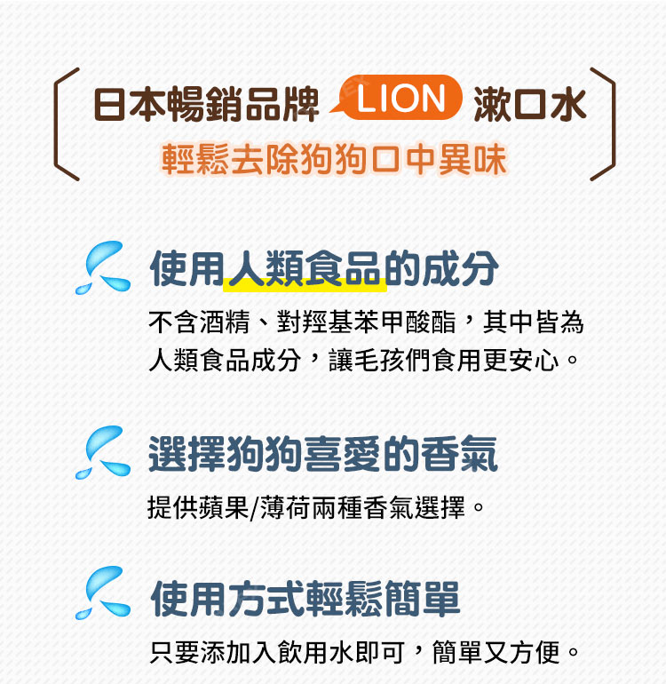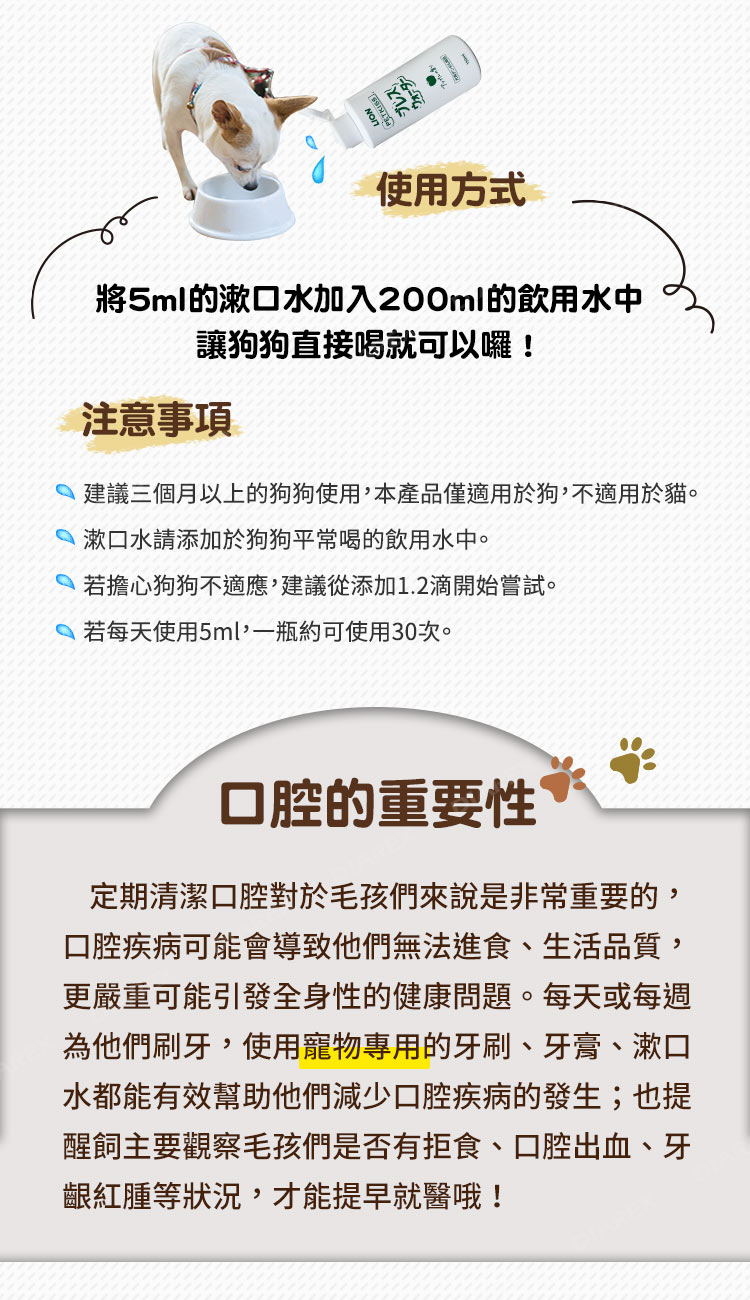 ●只要添加入狗狗的飲用水即可輕鬆去除口中異味