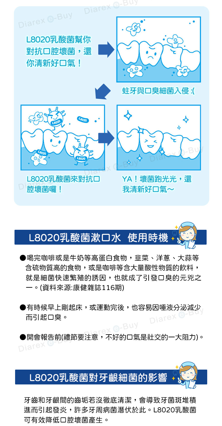 添加獨特L-8020乳酸菌,配合正確刷牙習慣,可有效預防口臭,幫助 清潔牙齒間的縫隙,保持口腔清新與健康,降低口腔細菌產生及牙周病發生率。