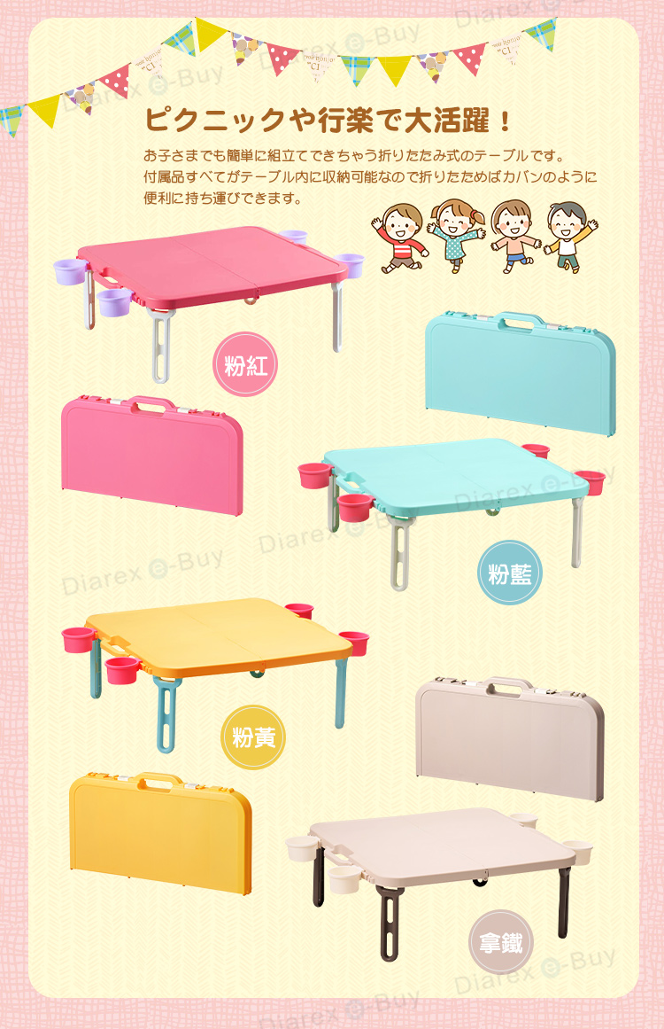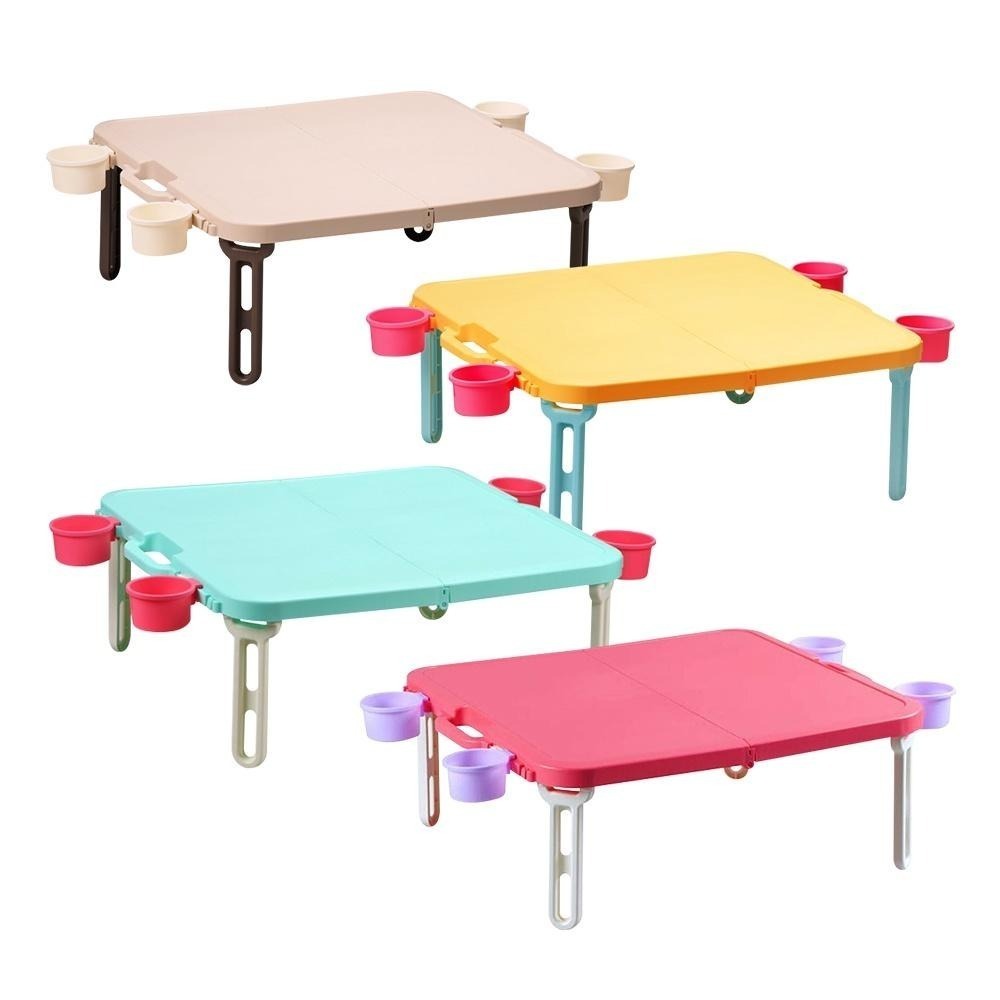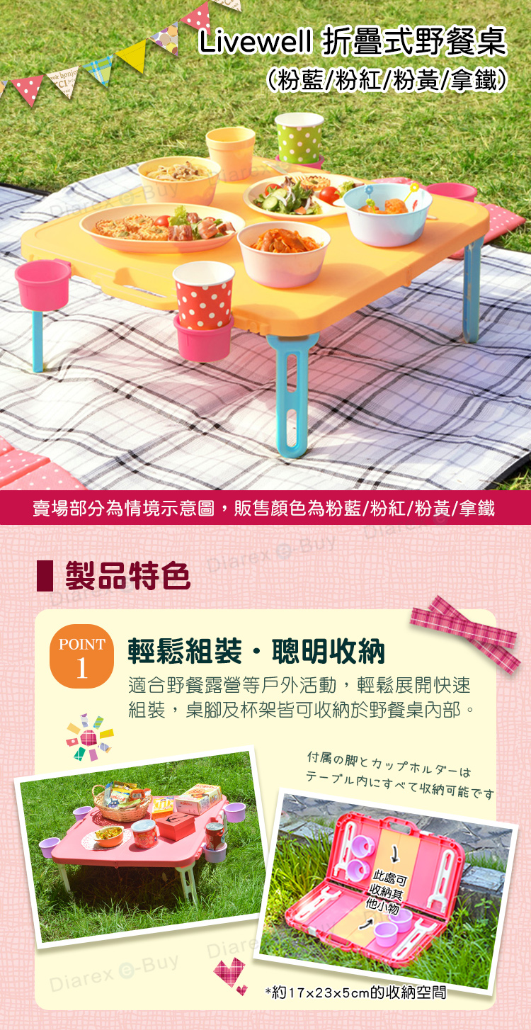 【日本Livewell】馬卡龍色系輕量便攜摺疊野餐桌(附杯架) 日本製 含掛勾 戶外露營桌 收納桌 手提桌