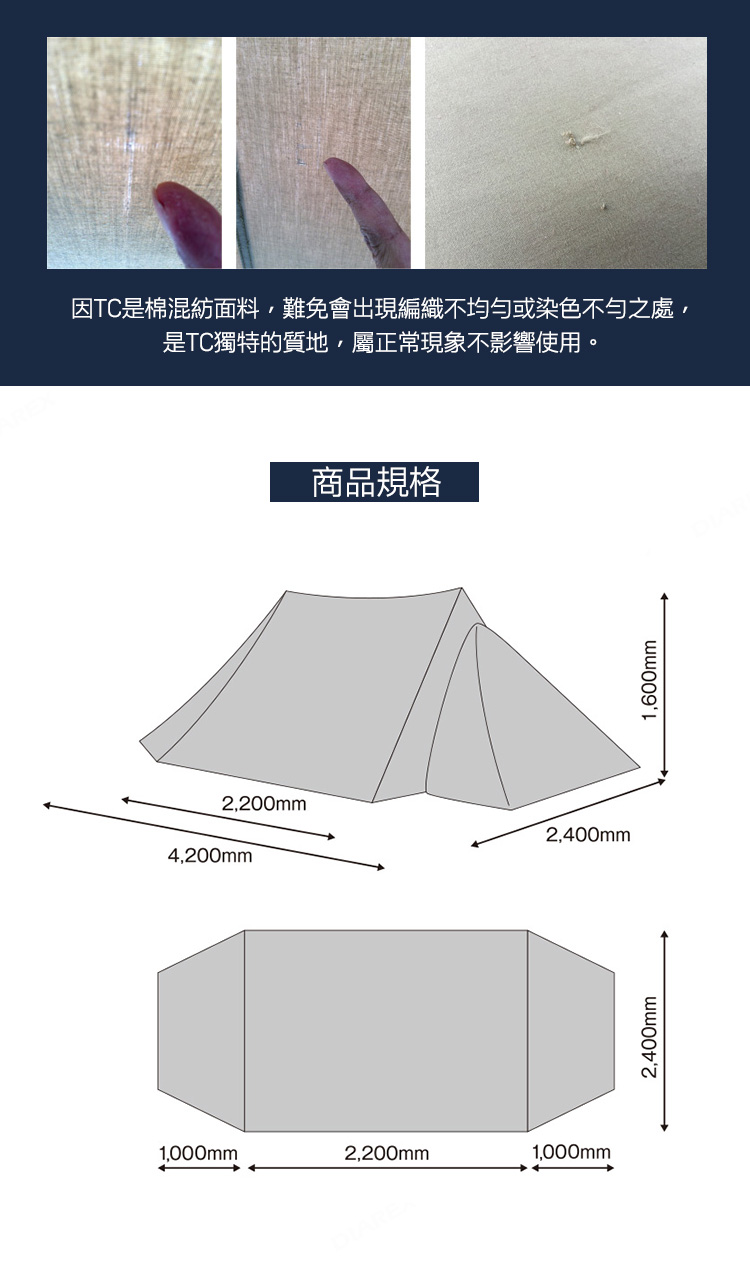 材質:外帳-TC棉混紡面料:65%憨酯纖維,35%棉(PU塗層/防水加工)