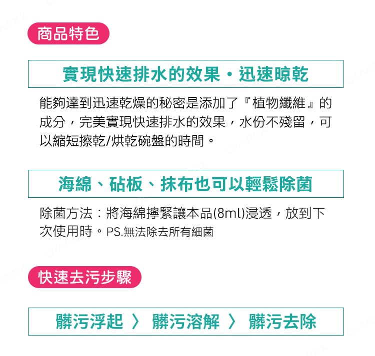 *海綿除菌方式:使用後,將海綿輕輕搓洗並擰乾,以本品8ml浸濕海綿,直至下次使用前再洗淨即可。(無法除去所有細菌)