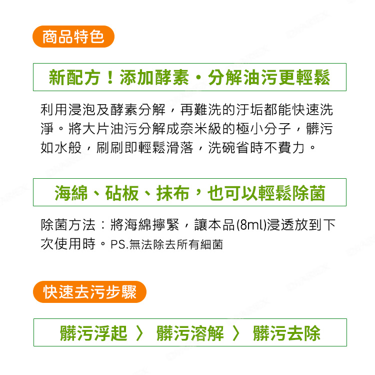 *海綿除菌方式:使用後,將海綿輕輕搓洗並擰乾,以本品8ml浸濕海綿,直至下次使用前再洗淨即可。(無法除去所有細菌)