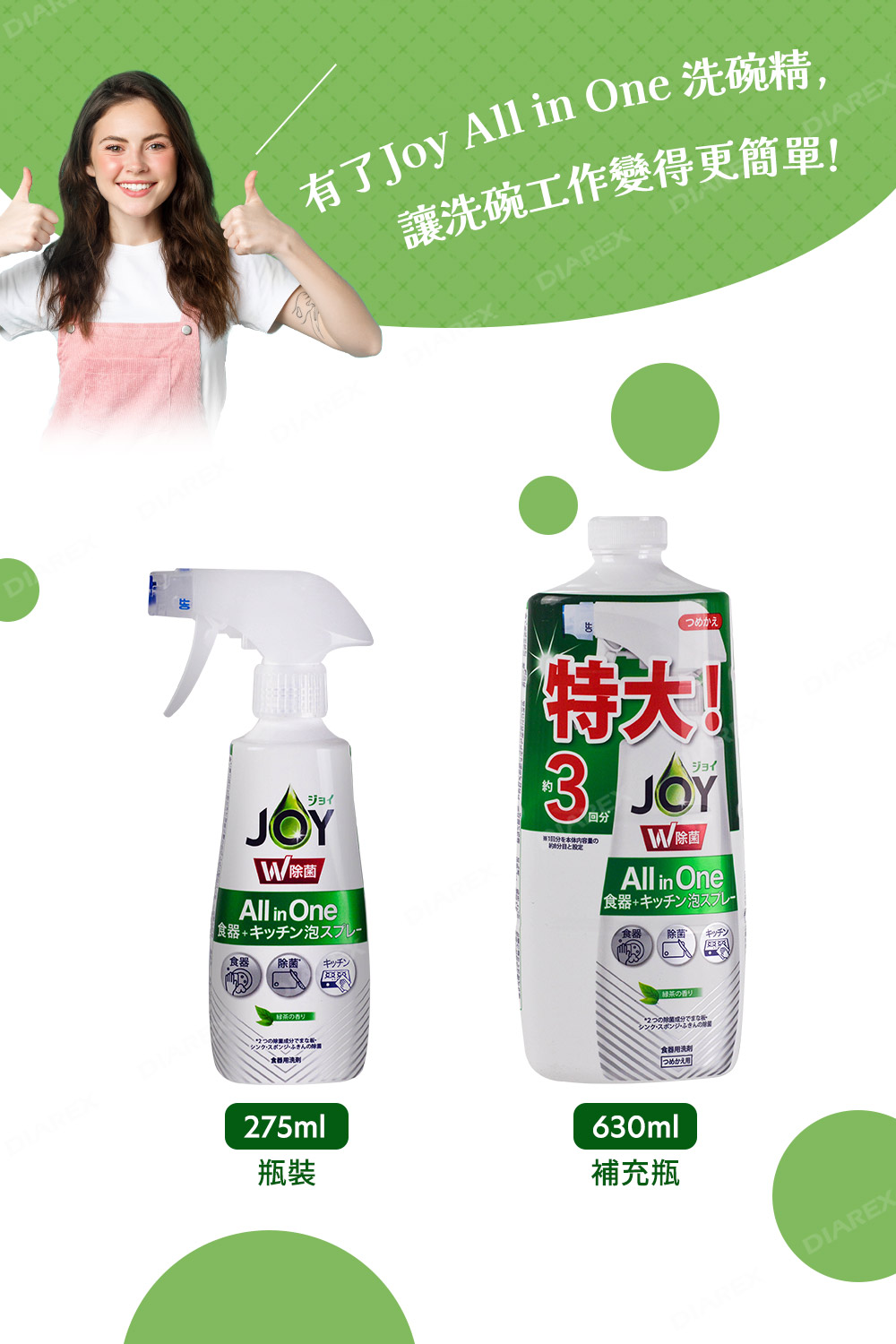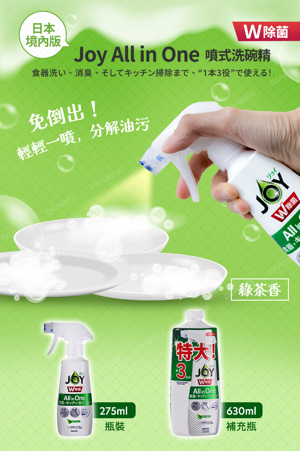 品名:日本P&G JOY ALL IN ONE系列洗碗精-除菌綠茶香噴式 (275ml/630ml)