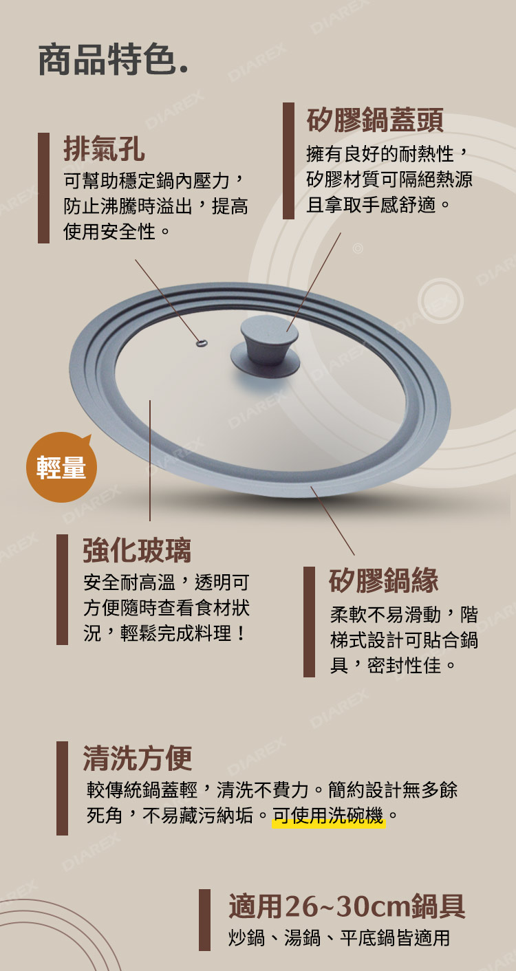 【材質】邊框+鍋蓋頭 – 矽膠(220°C)/鍋蓋 – 強化玻璃