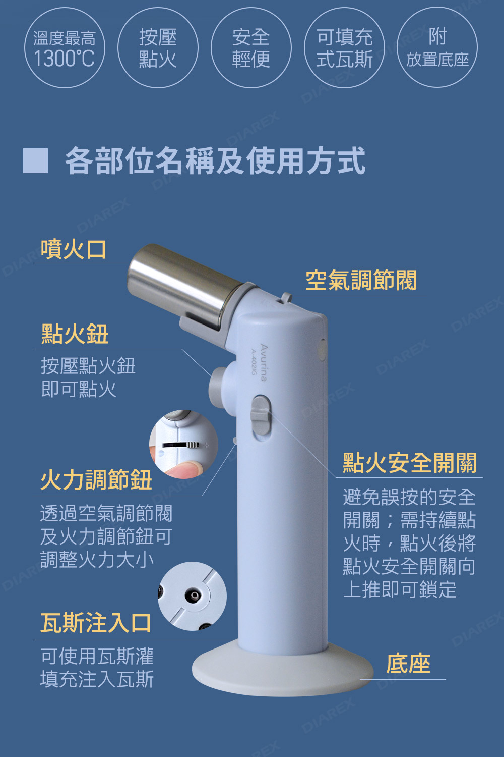 ●安全、輕便、可填充式瓦斯噴槍