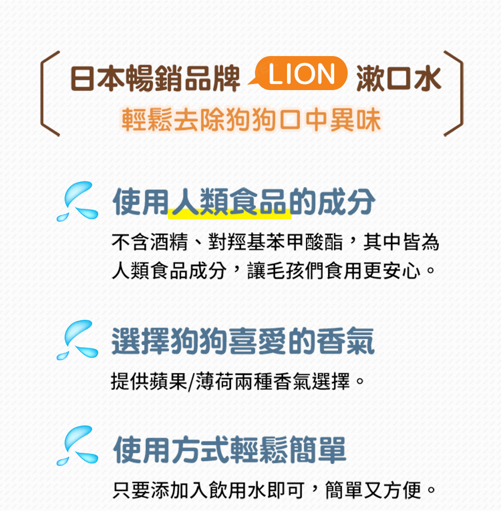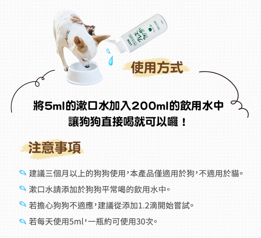 ●只要添加入狗狗的飲用水即可輕鬆去除口中異味