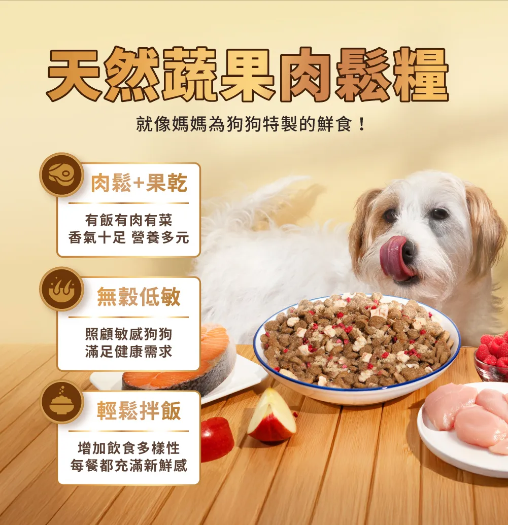 | 極品美味,營養飼料+零調味肉鬆+天然凍乾蔬果