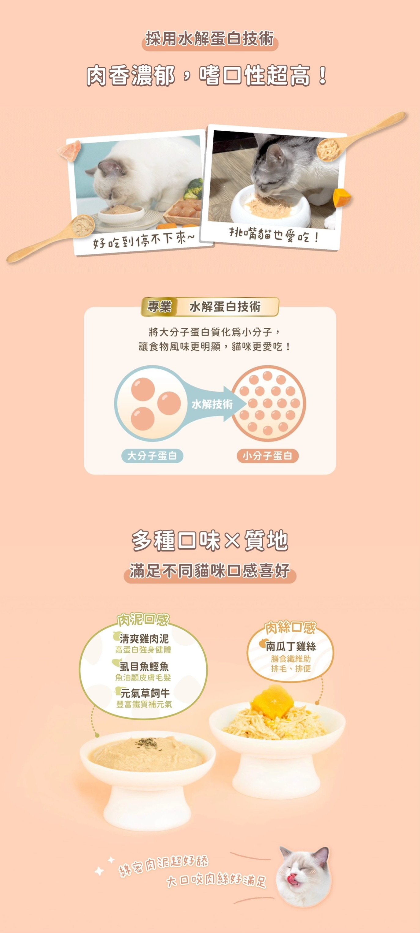 低內臟配方設計,減少腥味、口味更清爽!綿密肉泥&嚼感肉絲兩種質地選擇,可以滿足不同口感喜好的貓咪唷~