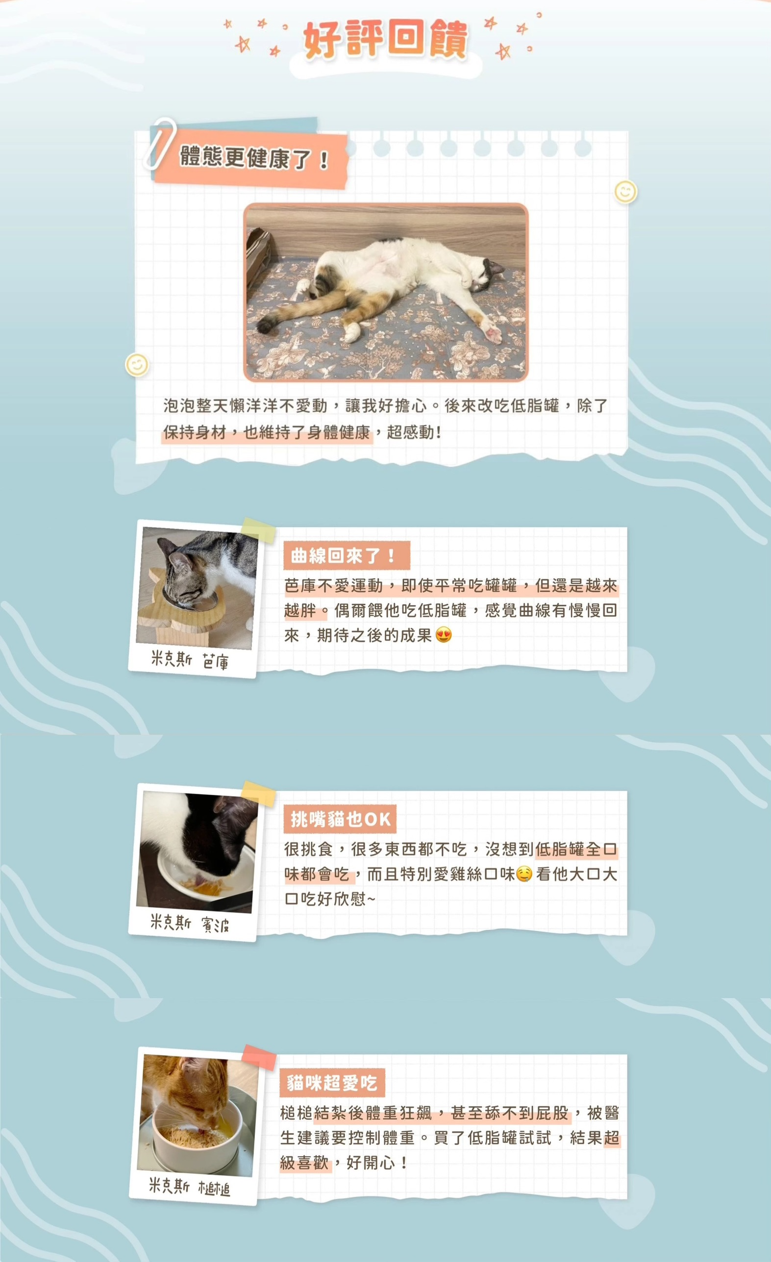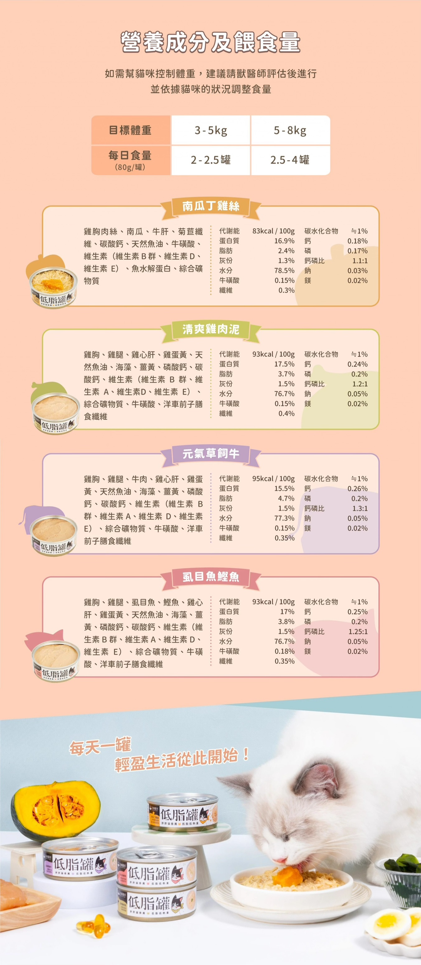 低脂罐依據 AAFCO/NRC 營養標準設計,正常體態的成貓可以跟日常主食搭配著吃,提早控制體重,維持好體態!