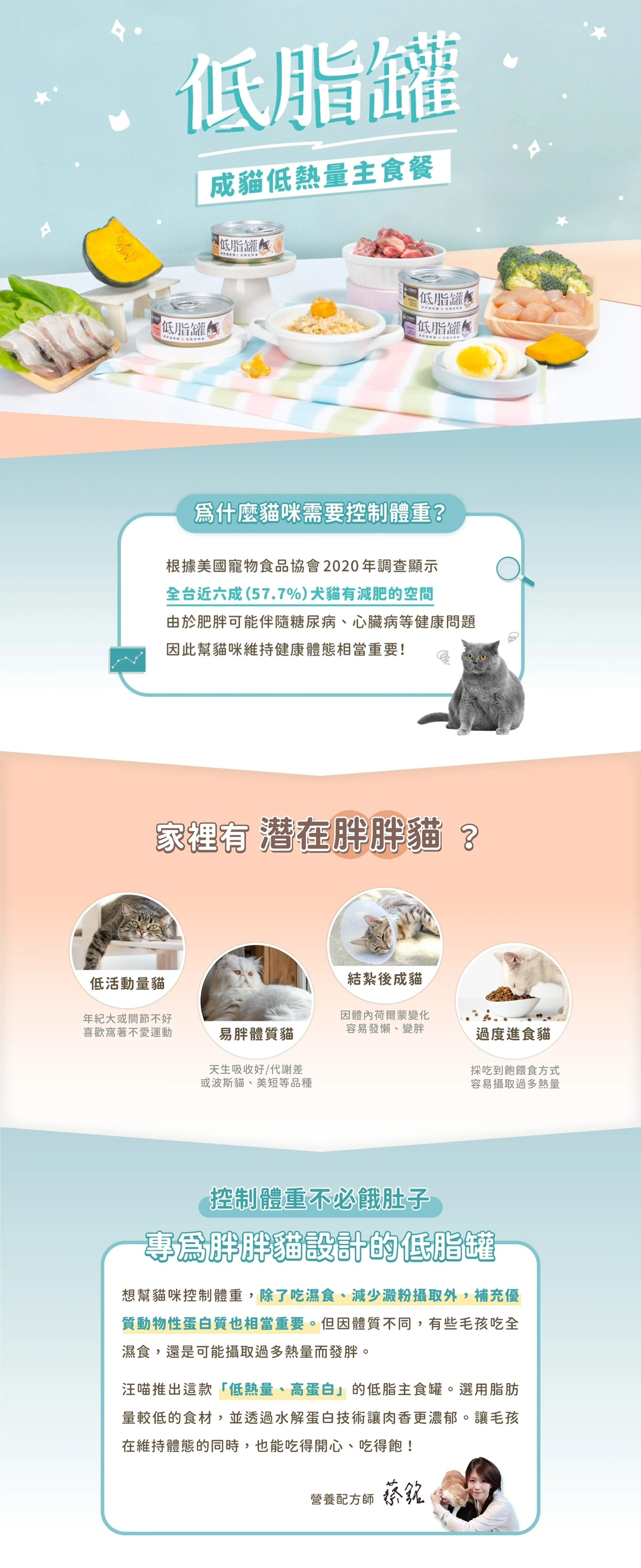 但如果是幼貓、手術後、懷孕哺乳貓,因為需要大量的能量就不太建議吃低脂罐,推薦吃汪喵營養罐補充能量;