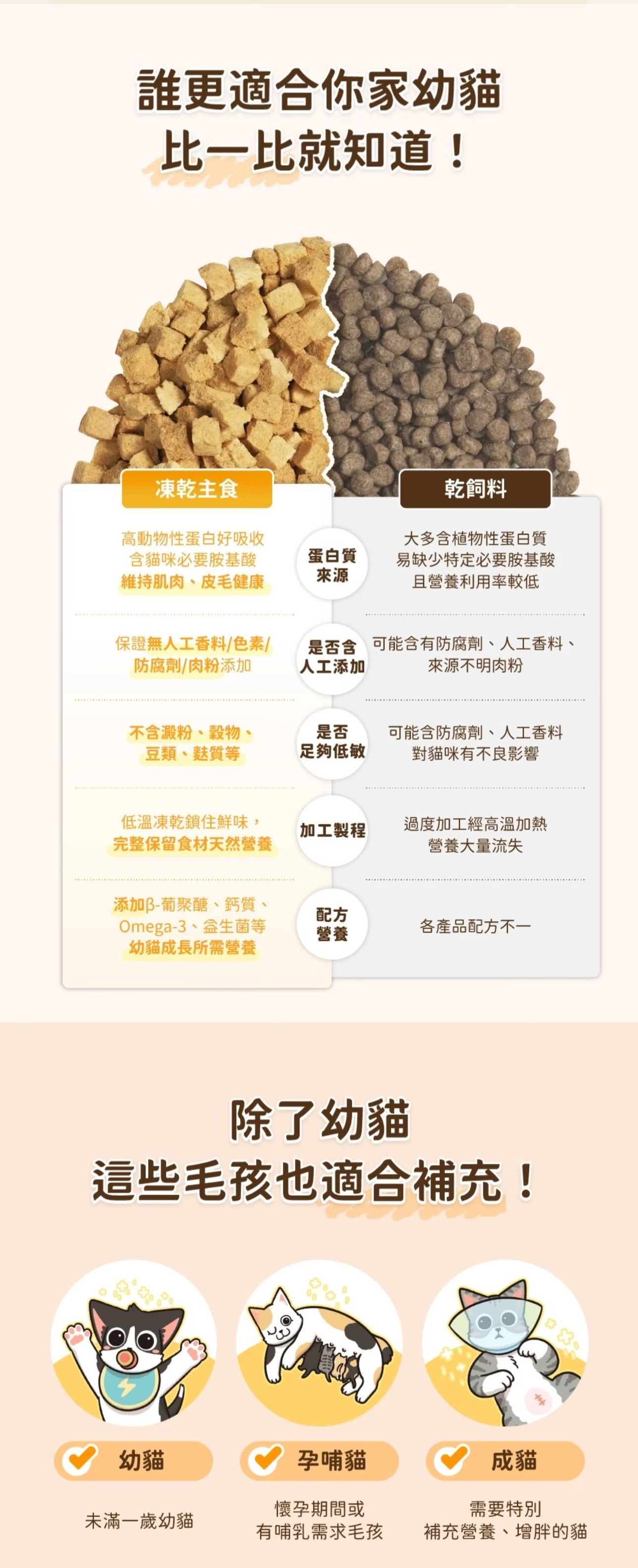一般稱一歲以下貓咪為幼貓,此款凍乾生食是依據AAFCO/NRC成幼貓營養標準設計,因此成貓後仍持續作為主食也沒有問題