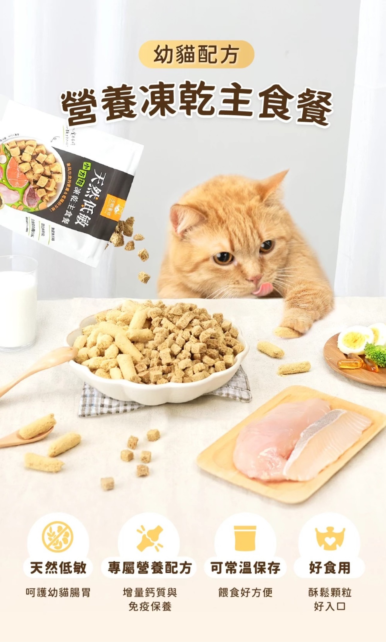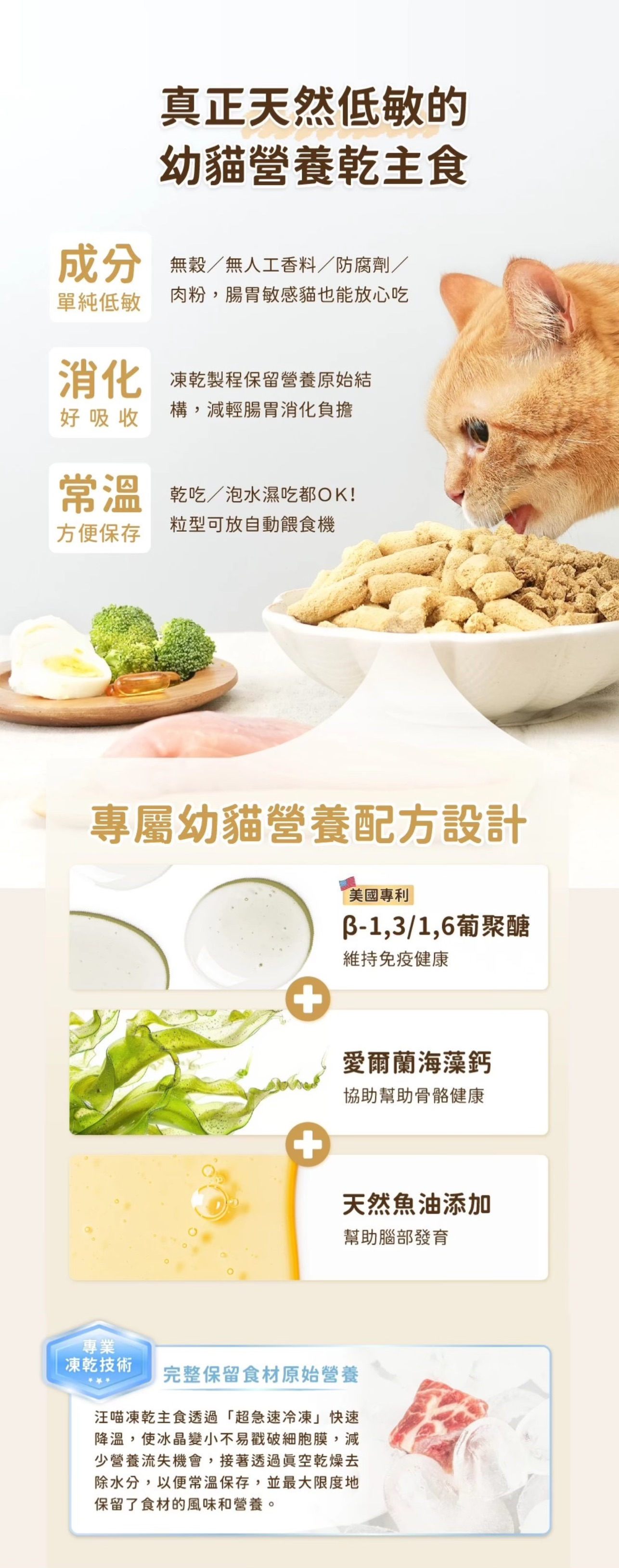 A:可以的!幼貓營養凍乾主食餐在配方上特別針對營養加強,也可以作為成貓日常主食,可參考每日建議餵食量控制攝取總量不怕胖!
