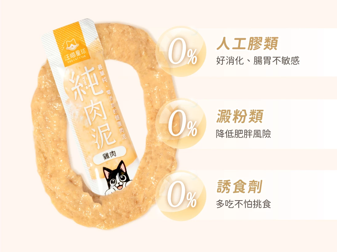 汪喵星球「無膠純肉泥」沒有額外添加任何的磷鈉、鹽、人工誘食劑、甜味劑等,是相對其他市售肉泥對腎貓更友善的選擇。
