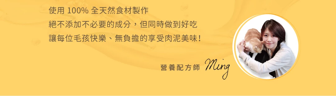 是用 75% 原肉 + 20% 高湯 + 5% 營養素(膳食纖維、魚油、牛磺酸、維生素 E),成分單純,毛拔麻可以放心餵!